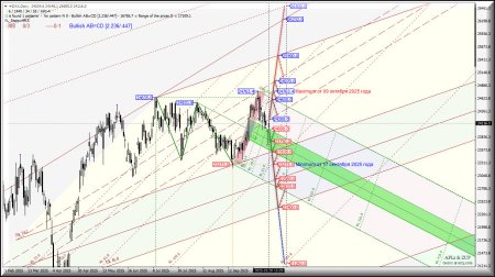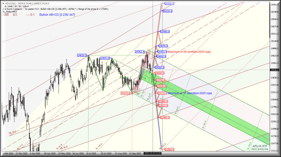 - уровень поддержки 24000.0 на верхней границе ISL38.2 зоны равновесия вил младшего операционного масштаба Minute-h4.Восходящее движение:Пробой уровня сопротивления 24200.0 определит развитие движения #DAX в канале 1/2 Median Line (24200.0 - 24600.0 - 24970.0) вил старшего операционного масштаба Minor-Daily с последующей перспективой достижения данным фондовым индексом начальной линии SSL Minor-Daily (25490.0). Нисходящее движение:Если будет пробита ISL38.2 Minute-h4 - уровень поддержки 24000.0 - тогда развитие движения Deutscher Aktienindex может быть продолжено в границах зон равновесия вил операционных масштабов - младшего-Minute-h4 (24000.0 - 23750.0 - 23530.0) и старшего-Minor-Daily (23530.0 - 22980.0 - 22400.0) с учетом отработки minimum 23273.5 от 17 сентября 2025 года и конечной линии FSL Minute-h4 (22833.0).____________________Обзор составлен без учета новостного фона, открытия торговых сессий основных финансовых центров и не является руководством к действию (выставления ордеров "sell" или "buy").Больше аналитики на сайте InstaForex.ZUP и Вилы Эндрюса (термины, понятия, параметры).