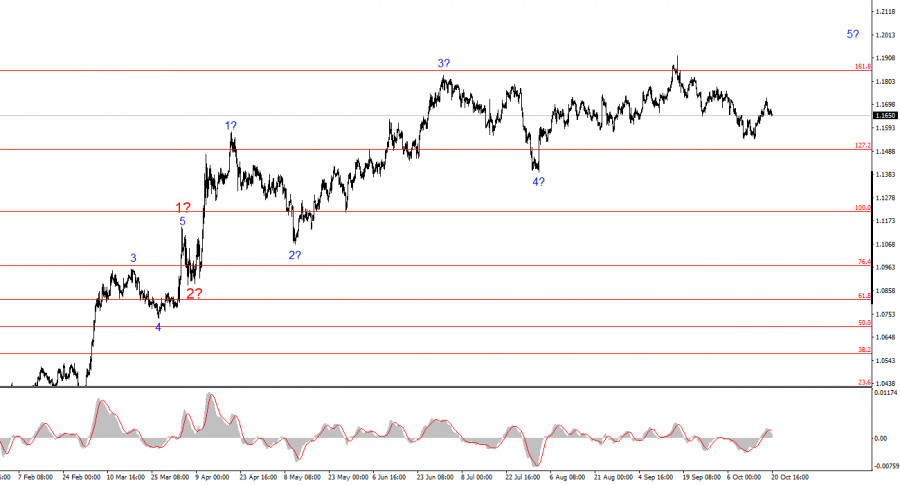 Волновая разметка 4-часового графика для инструмента EUR/USD преобразилась и, к сожалению, не в лучшую сторону. Пока еще рано делать выводы об отмене повышательного участка тренда, но последнее снижение европейской валюты привело к необходимости уточнения волновой разметки. Итак, теперь мы видим серию трехволновых структур a-b-c. Можно предположить, что они являются составной частью глобальной волны 4 повышательного участка тренда. В этом случае волна 4 приняла неестественно протяженный вид, но в целом волновая разметка сохраняет свою целостность. Построение повышательного участка тренда продолжается, а новостной фон продолжает поддерживать по большей части не доллар. Торговая война, начатая Дональдом Трампом, продолжается. Противостояние с ФРС продолжается. «Голубиные» ожидания рынка по ставке ФРС растут. В Америке продолжается «шатдаун». Рынок крайне невысоко оценивает результаты первых 9 месяцев Дональда Трампа, хоть экономический рост во втором квартале и составил почти 4%. На мой взгляд, построение повышательного участка тренда не завершено, а его цели разбросаны вплоть до 25-й фигуры. Исходя из этого, европейская валюта может снижаться еще некоторое время, не имея для этого никаких оснований(как в последние три недели), но волновая разметка все равно будет сохранять свою целостность.