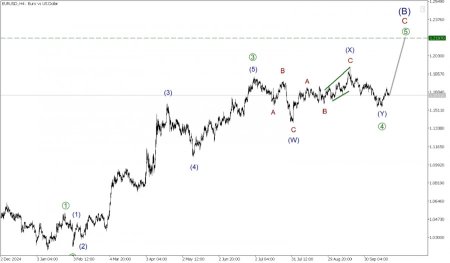 Рынок по Евродоллару в долгосрочной перспективе может формировать крупную бычью коррекция (B), которая принимает форму стандартного зигзага A-B-C. На сегодняшний день полностью завершены только первые две его части - импульс A и коррекция B. На последнем участке графика мы можем наблюдать развитие бычьей волны C, которая, по всей видимости, принимает форму импульса. На текущий момент завершены первые четыре его части - подволны [1]-[2]-[3]-[4]. В процессе построения ,бычья финальная подволна [5]. Большая вероятность, что быки внутри волны [5] смогут отправить рынок в область уровня 1.219. На указанной отметке величина крупной импульсной волны [5] составит 50% по расширению Фибоначчи от предыдущей импульсной волны [3]. Таким образом, при продолжении роста, стоит рассмотреть открытие длинных позиций с текущего уровня, с целью забрать прибыль на указанной отметке. После достижения уровня 1.219, ожидается смена тренда, а именно ожидается развитие финального медвежьего импульса (C). В текущей ситуации рекомендуется рассматривать открытие длинных позиций. Торговые рекомендации: Buy 1.165, takeprofit 1.219.