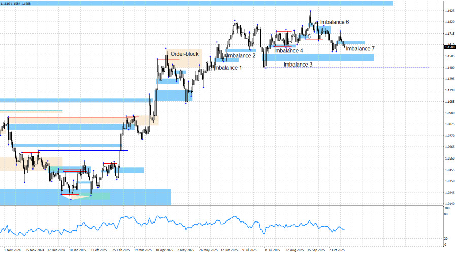 В понедельник, вторник и среду информационный фон для евро и доллара отсутствовал, а в течение текущей недели новостей и событий будет не очень много. Все самое интересное запланировано на пятницу. Три выступления президента ЕЦБ Кристин Лагард не дали никакой новой информации. Тем временем, на фоне информационного штиля медведи продолжают проводить атаки. Напомню также, что причин у быков продолжать атаковать имеется в достаточном количестве уже сейчас. Это и «голубиные» перспективы ДКП FOMC, это и общая политика Дональда Трампа, это и противостояние США с Китаем, это и акции протеста против Трампа, захлестнувшие Америку в третий раз в текущем году, это и слабость рынка труда, это и не радужные перспективы американской экономики. Таким образом, графический анализ остается сейчас не первом месте для трейдеров, а разрываться придется между двумя имбалансами. Первый – имбаланс 3 – притягивает к себе цену. Второй – имбаланс 7 – может быть инвалидирован уже сегодня. В любом случае реакции на имбаланс 7 получено не было, а значит и открывать сделки на покупку оснований тоже не было. Таким образом, ждем европейскую валюту еще ниже и реакции на имбаланс 3. В данное время графический анализ не поддерживает новое падение европейца. Тренд остается «бычьим», а движения в последние несколько месяцев – это боковик. Таким образом, графический анализ в данное время не позволяет пока рассматривать сделки на продажу. «Шатдаун» остается «головной болью» доллара, на который трейдеры пока никак не реагируют. С одной стороны, он не грозит американской экономике немедленными и серьезными потерями. С другой стороны, чем дольше он продолжается, тем сильнее замедляется экономика США. Каждая неделя может обходиться ей в 15 млрд $. Не следует также упускать из виду торговую войну Трампа и его давление на FOMC. В данное время Трамп активно продвигает идею новых тарифов для Китая и Индии в рамках компании по завершению войны в Украине. Более того, он требует введения аналогичных тарифов и от Евросоюза, желая объединить усилия против РФ. Китай также может нарваться на дополнительные пошлины с 1 ноября в размере 100%, если не отменит свое решение об усилении контроля над экспортом редкоземельных металлов. А Индия уже нарвалась на пошлины в размере 50%. Вряд ли такой информационный плацдарм поможет медведям сформировать целый тренд. Таким образом, в «медвежий» тренд я по-прежнему не верю. Информационный фон, во-первых, крайне сложно интерпретировать в пользу доллара, а во-вторых, он попросту не изменился в последнее время, чтобы ожидать резкую смену в настроении трейдеров. Синяя линия показывает ценовой уровень, ниже которого можно будет считать «бычий» тренд завершенным. До него медведям нужно пройти вниз еще около 220 пипсов, а у меня даже текущее падение вызывает нешуточное удивление. Ближайшей целью для роста европейской валюты может выступать только «медвежий» имбаланс 1,1976 – 1,2092 на недельном графике, который был образован еще в июне 2021 года. Календарь новостей для США и Евросоюза: США – Продажи домов (14-00 UTC). 23 октября календарь экономических событий содержит в себе только одну запись, которая никакого интереса не вызывает уже сейчас. Влияние информационного фона на настроение рынка в четверг будет слабым или отсутствовать. Прогноз по EUR/USD и советы трейдерам: 