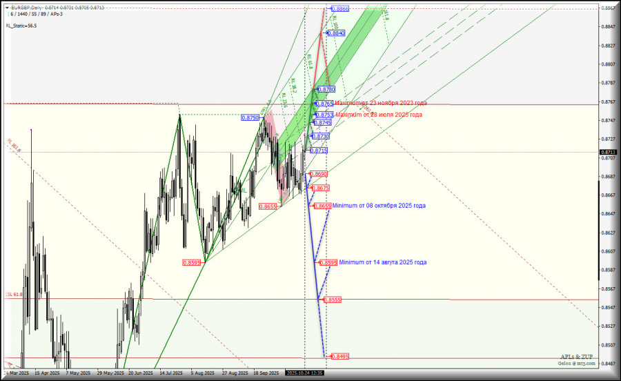 Операционный масштаб Minor (таймфрейм Daily)EUR/GBP - Daily - обзор вариантов развития движения данного валютного инструмента c 27 октября 2025 г.Предыдущий обзор USD/CHF (таймфрейм h4 ) от 22.10.2025 г. 15:46____________________Euro vs Great Britain PoundДвижение EUR/GBP - Daily с 27 октября 2025 года станет определяться отработкой и направлением пробоя диапазона:- уровень сопротивления 0.8715 на верхней границе канала 1/2 Median Line вил младшего операционного масштаба Minute-h4;