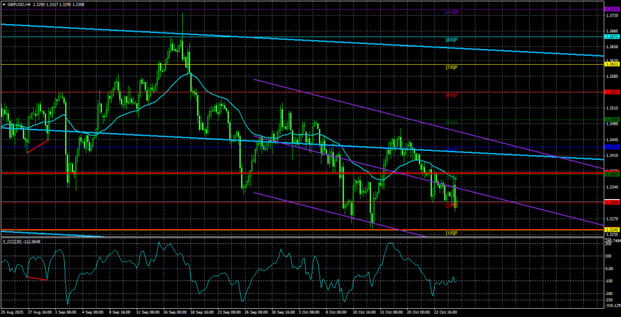 Валютная пара GBP/USD в течение пятницы вновь торговалась с понижением, хотя на этот раз для этого не то, чтобы не было никаких оснований, основания имелись противоположные – для покупок британского фунта. Утром в Великобритании было опубликовано три более или менее значимых отчета: по деловой активности в секторах услуг и производства, а также по розничным продажам. Все три отчета оказались позитивнее прогнозов экспертов. Таким образом, с самого утра имелись причины для роста британской валюты. Во второй половине дня в Америке был опубликован отчет по инфляции, который смело можно считать главным событием недели. Индекс потребительских цен в Штатах был опубликован с 10-дневной задержкой и продемонстрировал более слабый рост инфляции, чем предполагалось, – всего 3%. Базовая инфляция и вовсе снизилась до 3% в годовом выражении. Таким образом, этот отчет открывает перед ФРС возможность понизить ключевую ставку несколько раз. Напомним, что уверенность рынка в двух снижениях ставки до конца года зашкаливала в последнее время. Но отчет по инфляции поставил печать одобрения на это решение регулятора. Таким образом, доллар мог после этого отчета показать закономерное падение. Но тоже не показал... Также во второй половине дня были опубликованы индексы деловой активности в секторах услуг и производства США и индекс настроения потребителей от университета Мичиган. Индексы деловой активности оказались выше прогнозов экспертов, что было поводом покупать уже доллар, но в то же время индекс настроения потребителей показал очередное снижение. Таким образом, два не самых важных отчета(в Штатах публикуются гораздо более значимые индексы деловой активности ISM) поддержали доллар, а пять гораздо более важных публикаций указывали на его падение. Но по итогам дня доллар все равно вырос. Как мы и говорили, логики в движениях на рынке сейчас нет практически никакой. На дневном ТФ сохраняется флэт, и именно его мы считаем основным источником проблем трейдеров. Внутри флэта движения всегда рэндомные, что мы и наблюдаем весь октябрь. На следующей неделе состоится заседание ФРС, на котором вероятность снижения ключевой ставки составляет 146%. Поэтому можно было бы ожидать падение доллара. Но в этом решении рынок уверен уже целый месяц, в течение которого доллар уверенно растет. Поэтому вряд ли можно говорить об отработке этого события «авансом». Когда рынок начнет закономерно отрабатывать поступающую информацию – неизвестно. Может быть, заседание ФРС станет отправной точкой для нового витка восходящего тренда по EUR/USD и GBP/USD. Но, может быть, и нет. Мы считаем, что наиболее целесообразно ожидать возобновления восходящего тренда 2025 года в области 1,3100-1,3250. Именно там находятся два последних локальных минимума, около которых виток нисходящего движения в рамках флэта может завершиться. Средняя волатильность пары GBP/USD за последние 5 торговых дней составляет 63 пункта. Для пары фунт/доллар это значение является «средним». В понедельник, 27 октября, таким образом, мы ожидаем движения внутри диапазона, ограниченного уровнями 1,3245 и 1,3371. Старший канал линейной регрессии направлен вверх, что указывает на однозначную восходящую тенденцию. Индикатор CCI трижды заходил в область перепроданности, что предупреждает о возобновлении восходящего тренда. Ближайшие уровн