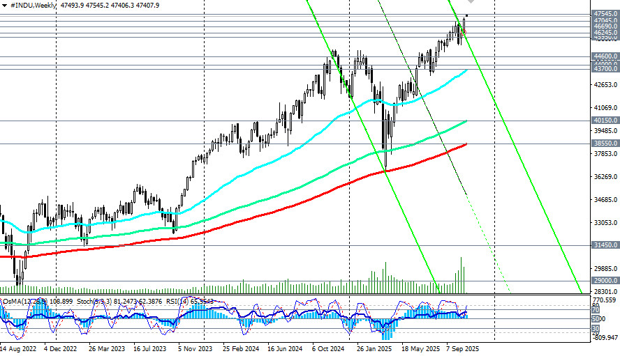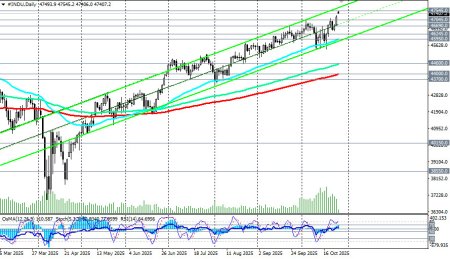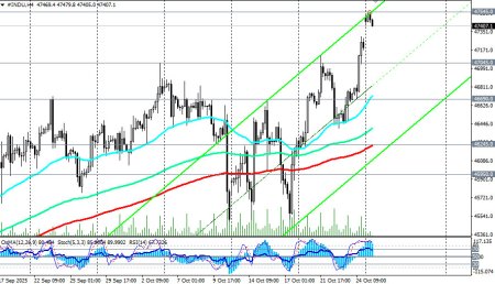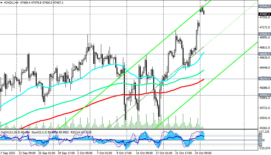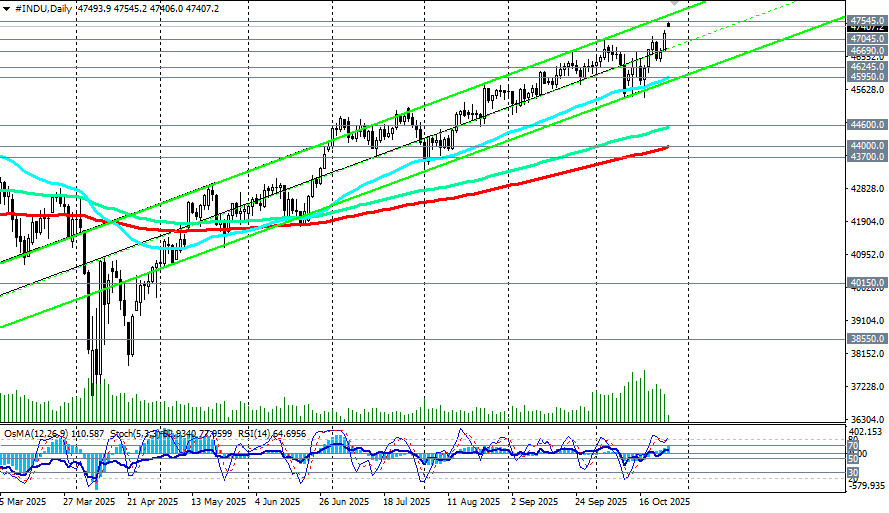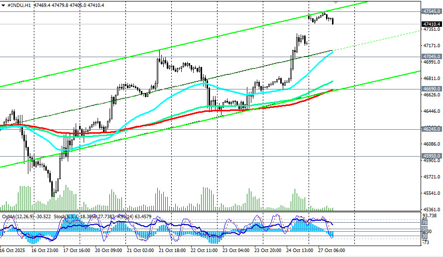 В ходе азиатской торговой сессии фьючерсы на американский промышленный индекс Dow Jones (сокращенно DJIA или INDU в торговом терминале) достигли нового рекордного максимума вблизи отметки 47545.0. Причиной такого рывка стало улучшение настроений инвесторов после прошедшей в воскресенье встречи представителей Китая и США, которые согласовали основные положения торгового соглашения в преддверии встречи президентов США Дональда Трампа и Китая Си Цзиньпина в Южной Корее позднее на этой неделе, отметили мы в нашем сегодняшнем фундаментальном анализе и обзоре «DJIA: торговое перемирие, заседание ФРС, Трамп». К моменту публикации данной статьи и в начале американской торговой сессии фьючерсы DJIA приблизились к отметке 47400.0, опустившись ниже цены открытия вблизи 47490.0. Цена на фьючерсы Dow Jones Industrial Average остается в зоне бычьего рынка, выше ключевых уровней поддержки 44000.0 (200-периодная скользящая средняя на дневном графике), 38550.0 (200-периодная скользящая средняя на недельном графике). Если напряженность на рынках продолжит спадать, то следует ждать возобновление глобальной восходящей динамики американского фондового рынка и его основных индексов. Пробой сегодняшнего «хая» и нового рекордного максимума вблизи отметки 47545.0 может стать сигналом для новых длинных позиций. Впрочем, коррекционное снижение к значимым уровням поддержки 46690.0 (ЕМА200 на 1-часовом графике), 46245.0 (ЕМА200 на 4-часовом графике), 45950.0 (ЕМА50 и нижняя граница восходящего канала на дневном графике) также может стать хорошей возможностью для входа в бычий тренд по более выгодным ценам. В альтернативном сценарии и после пробоя сегодняшнего важного уровня поддержки 45950.0 (ЕМА50 на дневном графике) снижение цены продолжится в сторону «круглой» отметки 45000.0 и минимумов месяца вблизи отметки 45400.0. Более глубокая коррекция подразумевает снижение цены к зоне ключевых среднесрочных поддержек и уровней 44600.0 (ЕМА144 на дневном графике), 44000.0 (ЕМА200 на дневном графике), удерживающих индекс DJIA в зоне среднесрочного бычьего рынка. От них же можно будет строить новые длинные позиции с расчётом на возобновление глобального бычьего тренда. В основном сценарии ожидаем возобновление роста и обновление рекордных максимумов выше отметки 47545.0.*) см. также S&P500:сценарии динамики на 27.10.2025
