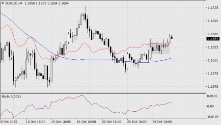 На графике четырёхчасового масштаба консолидация цены происходила под линией баланса, теперь цена закрепилась над ней. Осциллятор Марлин растёт, закрепившись на положительной территории, и его рост потихоньку ускоряется. Ждём цену у обозначенного целевого уровня.