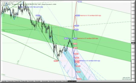 - уровень поддержки 0.9255 на начальной линии SSL вил младшего операционного масштаба Minuette-h1.Нисходящее движение.При пробое начальной линии SSL Minuette-h1 - уровень поддержки 0.9255 - нисходящее движение Euro vs Swiss Franc будет продолжено к нижней границе ISL61.8 (0.9244) зоны равновесия вил старшего операционного масштаба Minute-h4 с последующей возможностью достижения этим кросс инструментом границ канала 1/2 Median Line Minuette-h1 (0.9228 - 0.9218 - 0.9205) и зоны равновесия (0.9209 (minimum от 21 октября 2025 года) - 0.9195 - 0.9180) вил младшего операционного масштаба Minuette-h1.Восходящее движение.В случае пробоя maximum 0.9269 от 27 октября 2025 года на срединной линии Median Line Minute-h4 восходящее движение EUR/CHF может получить развитие к целям:- верхняя граница ISL38.2 (0.9292) зоны равновесия вил старшего операционного масштаба Minute-h4;