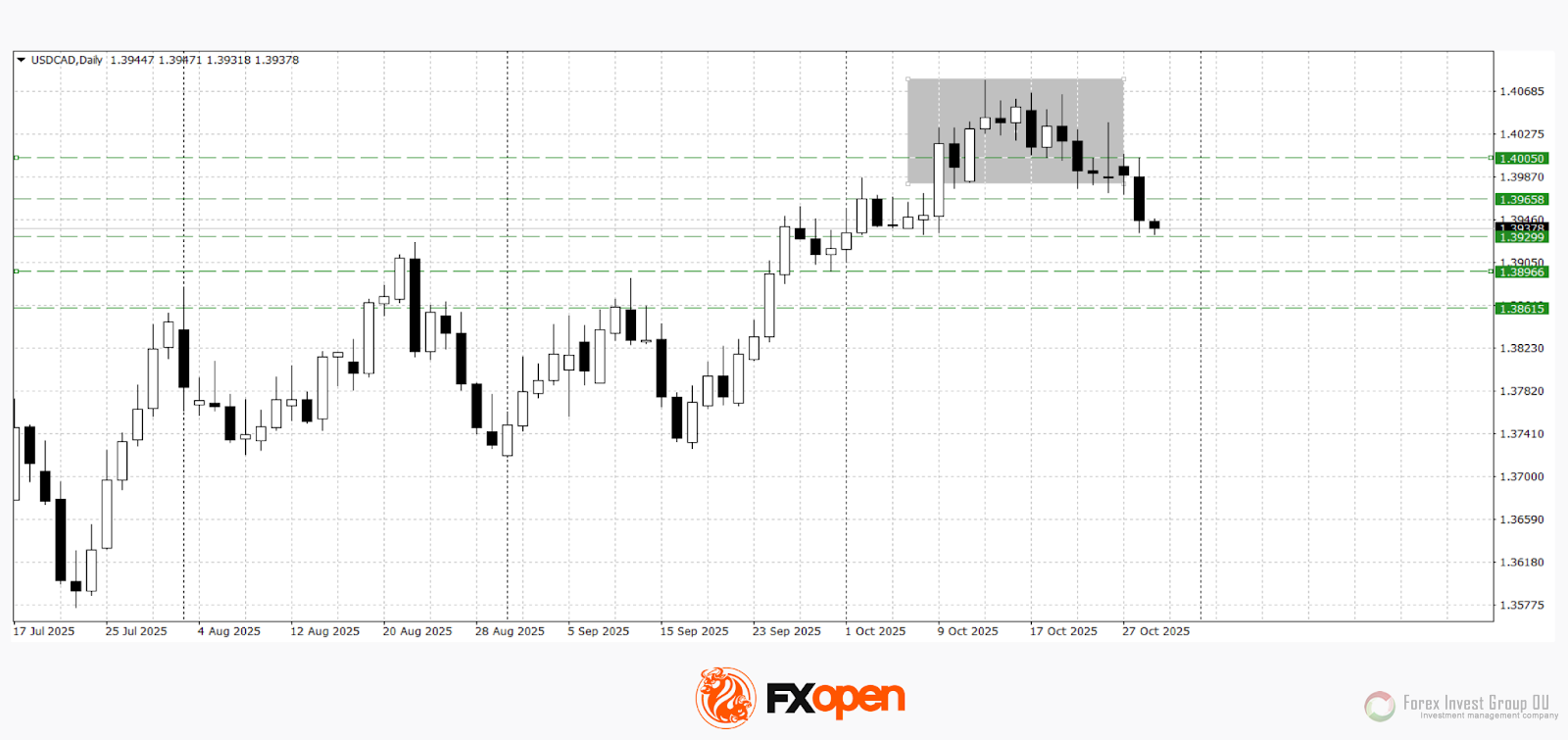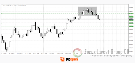 В паре USD/CAD наблюдается усиление нисходящего тренда в рамках отработки фигуры “Башня” (Tower Top). Цена протестировала важный диапазон 1.3930–1.3960. Если данные уровни перейдут в статус сопротивления, пара может продолжить снижение в направлении 1.3860–1.3900. Отмену нисходящего сценария можно рассматривать после уверенного закрепления выше 1.4000.