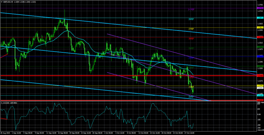 Валютная пара GBP/USD в течение продолжала нисходящее движение еще до публикации результатов заседания ФРС и выступления Джерома Пауэлла. Напомним, что в последние несколько недель мы постоянно обращаем внимание читателей на полную алогичность текущего падения британской валюты. Нет, мы не считаем, что фунт стерлингов не может или не должен падать в принципе. Мы лишь констатируем, что оснований для этого нет никаких. Из-за чего фунт начал падать на этой неделе? Потому что Канцлер Великобритании Рэйчел Ривз в очередной раз дала интервью, которое очень сильно не понравилось трейдерам. Но почему оно не понравилось трейдерам? Потому что госпожа Ривз говорила о восстановлении связей с Евросоюзом? Задумайтесь, а что в этом такого? Лондон признает свою ошибку, связанную с Brexit, или, по крайней мере, признает, что без Европы ему живется не так хорошо, как предполагалось. Лондон хочет восстановить разрушенные связи, укрепить существующие. И что в этом плохого для британской экономики и страны в целом? Но фунт стерлингов во вторник падал вниз так, как будто ФРС повысила ключевую ставку, а Банк Англии в то же время ее снизил сразу на полпроцента. Кстати, на следующей неделе состоится заседание Банка Англии и пока официальные прогнозы говорят о том, что параметры монетарной политики изменены не будут по итогам предпоследнего заседания в 2025 году. В этом нет ничего удивительного, так как британская инфляция растет уже больше года и на данный момент превышает целевой уровень БА почти в 2 раза. Последний отчет по инфляции, хоть и спровоцировал падение британской валюты, абсолютно ничего не поменял для нее. По итогам сентября индекс потребительских цен не увеличился, но что это меняет для Британского регулятора или британского фунта? 3,8% – это в любом случае гораздо больше, чем 2%. Таким образом, в ближайшее время Банк Англии, вероятно, не будет проводить смягчение монетарной политики, а ФРС – очень даже будет. Каким бы ни было состояние рынка труда США, скоро наступает 2026 год, и в мае этого года Джером Пауэлл уйдет в отставку. Вместо него придет новый «человек Трампа», но на этот раз он займет свой пост не на некоторое время, а надолго. И занимать он будет пост не рядового члена Комитета FOMC, а главы FOMC. Трамп получит в свое распоряжение не просто еще одного человека, который будет готов поддерживать снижение ключевой ставки на каждом заседании, а еще и человека, который будет оказывать давление на «ястребов» внутри ФРС. С нашей точки зрения, вопрос снижения ключевой ставки ФРС до значений значительно ниже «нейтральной» ставки – это лишь вопрос времени. А на инфляцию в 2026 году ФРС может вообще никакого внимания не обращать. Она будет и дальше расти, ставка снижаться, «потому что рынок труда требует поддержки». Средняя волатильность пары GBP/USD за последние 5 торговых дней составляет 78 пунктов. Для пары фунт/доллар это значение является «средним». В четверг, 30 октября, таким образом, мы ожидаем движения внутри диапазона, ограниченного уровнями 1,3153 и 1,3309. Старший канал линейной регрессии направлен вверх, что указывает на однозначную восходящую тенденцию. Индикатор CCI четырежды заходил в область перепроданности, что предупреждает о возобновлении восходящего тренда. Ближайшие уровни поддержки: S1 – 1,3245 S2 – 1,3184 S3 – 1,3123 Ближайшие уровни сопротивления: R1 – 1,3306 R2 
