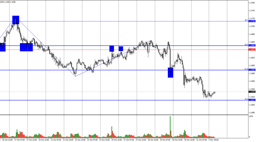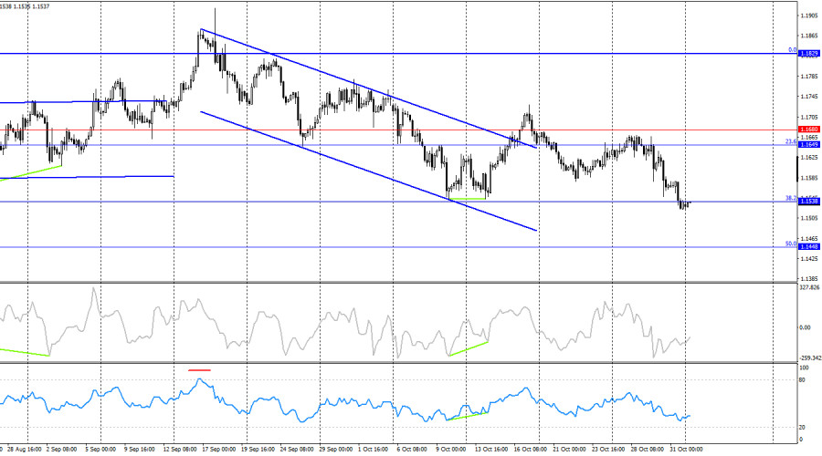 Ситуация с волнами на часовом графике остается простой и понятной. Последняя завершенная волна вверх не пробила пик предыдущей волны, а последняя волна вниз пробила предыдущий лоу. Таким образом, в данное время тренд вновь поменялся на «медвежий». Трейдеры-быки в очередной раз не сумели воспользоваться предоставленными возможностями для наступления, а медведи атакуют зачастую на голом энтузиазме, не имея информационной поддержки. В пятницу информационный фон был достаточно скудным, но трейдеры-медведи вновь сумел выжать из него максимум. Всего в течение дня вышло два отчета, оба – в Европе. Объемы розничной торговли в Германии в сентябре выросли на 0,2%, как и ожидалось большинством трейдеров, а индекс потребительских цен в Евросоюзе составил 2,1% г/г, как ожидалось большинством трейдеров. Таким образом, значения обоих отчетов совпали с прогнозами на 100%. Не совпало лишь значение базовой инфляции, которая составила 2,4% при прогнозах снижения до 2,3%. Октябрь стал первым месяцем с мая, когда инфляция в Европе замедлилась, а не ускорилась. Если это единичный случай, то он ни на что не повлияет. Если инфляция и дальше будет располагаться чуть выше 2%, то ЕЦБ не будет менять процентные ставки. Дальнейший рост может вызвать ужесточение ДКП, но для этого требуется стабильный и длительный рост. Снижение инфляции ниже 2% намекнет на возможное новое смягчение ДКП, но снижение также должно быть длительным и сильным.