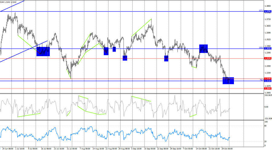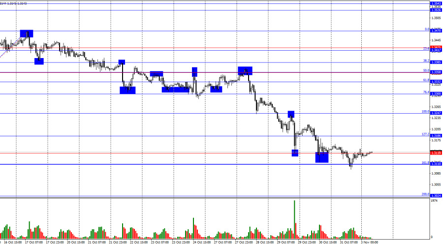 Ситуация с волнами остается «медвежьей». Последняя завершенная волна вверх пробила предыдущий пик, а последняя волна вниз (все еще формируется) давно пробила предыдущий лоу. Информационный фон в последние недели был негативным для доллара США, но трейдеры-быки все это время не пользовались предоставленными возможностями для наступления. На прошлой неделе они и вовсе резко отступили с рынка, несмотря на снижение процентной ставки ФРС. В пятницу информационный фон для британца и американца отсутствовал, а медведи наконец-то прекратили ежедневные атаки на пустом месте. Графический анализ в начале новой недели может выйти на первый план, так как зона 1,3110 – 1,3139 – это достаточно сильная зона и она может перекрыть собой информационный фон. Сегодня трейдеры будут ожидать индекс деловой активности ISM в секторе производства США и, если этот показатель окажется хуже ожиданий, пара может начать долгожданный рост. Хотя бы в рамках коррекционного отката, которых мы не видели с 17 октября. Также на этой неделе состоится заседание Банка Англии, и трейдеры не ожидают, что параметры ДКП будут изменены в «голубином» направлении. Однако не все так просто. Процентную ставку Банк Англии вряд ли снизит, но итоги голосования по ставке могут разочаровать трейдеров-быков. Я не вижу причин голосовать за снижение ставки в ноябре, так как инфляция в Великобритании остается гораздо выше целевого уровня. Но у комитета MPC может быть свое мнение по этому поводу.