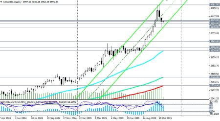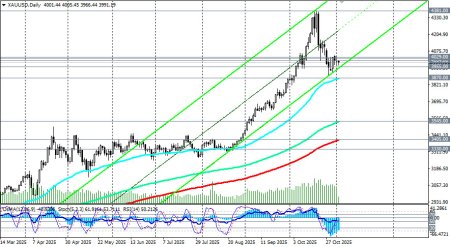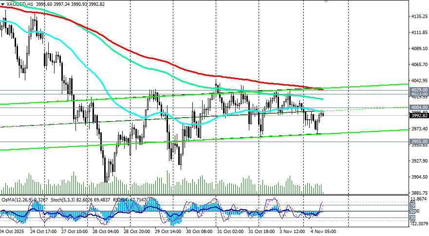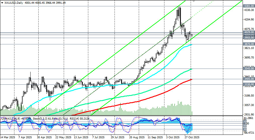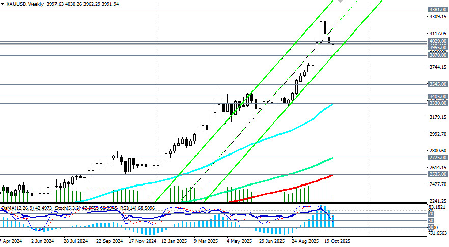 И все же, несмотря на снижение, цена на золото остается в глобальном бычьем тренде. Сильной поддержкой в данном случае выступают уровни 3955.00 (ЕМА200 на 4-часовом графике), 3870.00 (ЕМА50 на дневном графике). Между отметками 3955.00 и 4000.00 также проходит нижняя линия восходящего канала на дневном графике. Учитывая бычий тренд золота и позитивные на его счет прогнозы экономистов, можно, вероятно, рассчитывать на отбой и возобновление роста в зоне 3955.00 – 3870.00. Пробой «круглой» психологически-значимой отметки 4000.00 и краткосрочного уровня сопротивления 4029.00 (ЕМА200 на 1-часовом графике) может стать своеобразным «спусковым крючком» для возобновления восходящей динамики цены. В основном сценарии ожидаем возобновление роста XAU/USD с перспективой возврата к зоне недавних рекордных максимумов вблизи отметки 4381.00 с промежуточными целями вблизи локальных уровней сопротивления 4150.00, 4200.00, 4250.00, 4300.00. Ожидания дальнейшего смягчения политики ФРС, геополитическая напряжённость и «шатдаун» правительства США создают благоприятный фон для защитного золота. Но, несмотря на общую картину роста котировок, сохраняется риск быстрого разворота тенденции, особенно в условиях повышенной волатильности на мировых рынках, отметили мы в нашем сегодняшнем обзоре «XAU/USD: покупки рискуют оказаться преждевременными». Поэтому пробой поддержки на уровне 3955.00 (ЕМА200 на 4-часовом графике) может спровоцировать снижение к 3900.00 («круглый» уровень) и уровню 3870.00. От него же, учитывая глобальный бычий тренд, можно будет вновь рассчитывать на отбой и возобновление роста. Пробой же поддержки 3870.00 выглядит маловероятным. Ну а пока что колебание цены вокруг отметки 4000.00 и движение в диапазоне 4029.00 - 3955.00 долларов за унцию создают условия для диапазонной торговли. открыть торговый счет + зарегистрироваться в системе копирования сигналов + инвестировать в ПАММ-системеМатериал предоставлен компанией InstaForex - www.instaforex.com