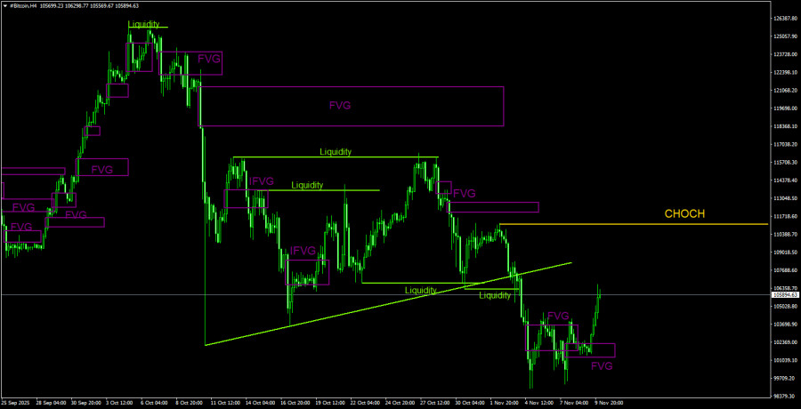 На 4-часовом таймфрейме техническая картина преобразовалась, и теперь нисходящий тренд не вызывает сомнений. Линия CHOCH(слом тренда) проходит на уровне 111 100$, и только выше этого уровня можно будет считать, что локальная тенденция сломлена. При чем цена должна не просто пробить его(что будет считаться снятием ликвидности с очевидного экстремума), а закрепиться выше него. До этого нисходящий настрой рынка сохраняется. На 4-часовом ТФ в данное время нет паттернов, от которых падение могло бы возобновиться, поэтому все внимание – на дневной «медвежий» FVG.Рекомендации по торговле BTC/USD: