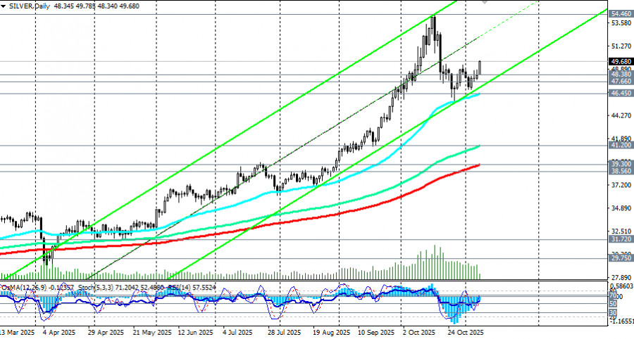 *) см. также: Торговые индикаторы InstaForex по XAG/USD[/i] В нашем сегодняшнем обзоре «[i]XAU/USD: возродившийся оптимизм покупателей» мы отметили резкий рост котировок золота и пары XAU/USD в ходе азиатской торговой сессии. Аналогичная картина складывается вокруг динамики цены на серебро. В начале сегодняшней европейской торговой сессии пара XAG/USD (SILVER в торговом терминале) превысила отметку 49.78, достигнув, таким образом, максимума с 22 октября. *) динамика цен серебра тесно связана с динамикой золота. Повышенный спрос на оба металла наблюдается в периоды неопределённости на глобальном рынке, подчёркивая их традиционную роль защитных инструментов. Специалисты обращают внимание на многочисленные драйверы, определяющие ценность серебра начиная от промышленного потребления и заканчивая его статусом альтернативного актива для инвесторов. Оно активно применяется в электронике, солнечной энергетике и медицинских технологиях, что увеличивает спрос и обеспечивает дополнительную устойчивость цене. Экономические показатели крупных индустриальных центров мира, таких как США, Китай и Индия, оказывают непосредственное влияние на динамику цен на серебро. Любой значительный сдвиг в производстве или потреблении этих регионов немедленно отражается на колебаниях стоимости металла. Несмотря на недавнюю турбулентность, цена на серебро остается в зоне глобального бычьего рынка, также как и золото. Это свидетельствует о сохраняющемся интересе инвесторов к этим металлам даже в условиях позитивных сигналов с финансовых рынков. Основные факторы влияния на рынок серебра - Оптимизм вокруг экономики США: законодательные инициативы, направленные на завершение временного закрытия американского правительства («шатдаун»), создают благоприятные условия для инвестиций в рискованные активы, однако пока не оказывают значительного давления на цены серебра. - Индикатор общего состояния рынка: улучшение общих экономических показателей и снижение торговой напряжённости между крупными мировыми державами также поддерживают позитивные ожидания относительно будущего курса металла. - Монетарная политика ФРС: рынки ожидают сокращение ключевой ставки на четверть процента (25 б.п.) в декабре примерно с вероятностью в 63,0%. Техническая картина Серебро вернулось к росту и растет в цене 4-й день подряд, торгуясь в зоне устойчивого бычьего рынка и выше ключевых среднесрочных и долгосрочных уровней поддержки 39.30, 29.75 (200-периодные скользящие средние на дневном и недельном графиках цены). Всего же с начала года к текущему моменту цена прибавила примерно 80%. Если бы не недавнее падение с рекордного максимума 54.46, то рост бы составил 90%. Технические индикаторы (в нашем случае это - RSI, OsMA, Стохастик) на дневном графике вновь разворачиваются на длинные позиции, сигнализируя о завершении коррекции. Сохраняется устойчивый бычий тренд. С этой точки зрения пробой текущего внутридневного максимума 49.78 и закрепление цены выше него могут стать сигналом для новых покупок. Ближайшие уровни поддержки и сопротивления Уровни поддержки: 49.00, 48.38, 48.00, 47.66, 47.00, 46.45 Уровни сопротивления: 49.90, 50.00, 51.00 Вывод Серебро продолжает оставаться востребованным активом для многих инвесторов, ищущих пути сохранить капитал в трудные времена. В целом преобладает восходящая динамика и бычий импульс, который при 