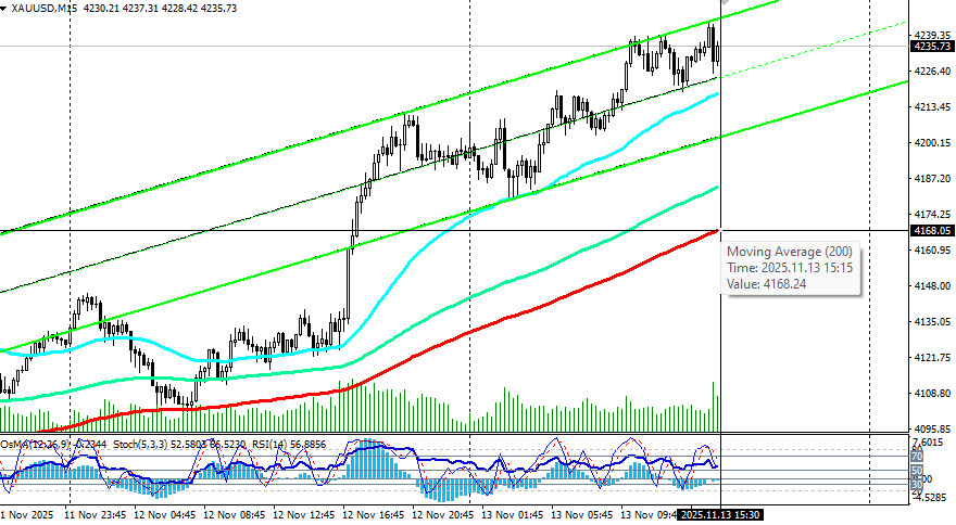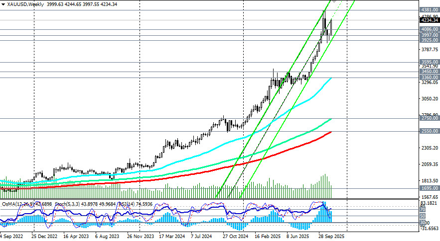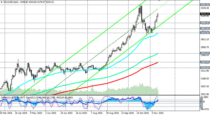 Дальнейшее развитие событий вокруг денежно-кредитной политики ФРС и возможных решений относительно финансирования бюджета станут ключевыми факторами, определяющими будущее движение цены на золото. В то же время, сохраняется стабильный восходящий импульс, а цена золота имеет потенциал для достижения новых высот, несмотря на временные коррекции, отметили мы в нашем сегодняшнем фундаментальном анализе и обзоре «XAU/USD: ключевые факторы и стабильный восходящий импульс». Технические индикаторы (в нашем случае это – RSI, OsMA, Стохастик) на дневном графике развернулись на длинные позиции. При этом, индикатор RSI демонстрирует состояние перекупленности на недельном графике, что, с одной стороны, говорит о возможном временном откате или фазе стабилизации курса, а с другой – о сохраняющемся сильном бычьем импульсе, что подразумевает вероятность дальнейшего роста. Преодоление зоны сопротивления в диапазоне 4230.00–4250.00, вероятно, позволит котировкам двигаться к новым вершинам выше исторических максимумов, достигнутых вблизи 4381.00. Таким образом, новым сигналом в основном сценарии может стать пробой сегодняшнего максимума 4245.00 и рост выше 4250.00. В альтернативном сценарии после сегодняшнего и недавнего 7-дневного роста последует коррекция в сторону уровней поддержки 4086.00 (ЕМА200 на 1-часовом графике), 4000.00, 3997.00 (ЕМА200 и нижняя линия восходящего канала на 4-часовом графике), от которых можно строить новые, относительно безопасные, длинные позиции. Ближайшие же уровни поддержки находятся на уровнях 4200.00 («круглый» уровень), 4170.00 (ЕМА200 на 15-минутном графике), 4100.00 («круглый» уровень), вблизи которых, учитывая возрождающийся сильный бычий импульс и долгосрочный восходящий тренд, также возможно наращивание «лонгов». Кстати, наш предыдущий прогноз (возобновление роста с перспективой возврата к зоне недавних рекордных максимумов вблизи отметки 4381.00 с промежуточными целями вблизи локальных уровней сопротивления 4150.00, 4200.00, 4250.00, 4300.00) наполовину уже оправдался - цена достигла выделенные нами уровни 4150.00, 4200.00 и находится в непосредственной близости от 4250.00. открыть торговый счет + зарегистрироваться в системе копирования сигналов + инвестировать в ПАММ-системеМатериал предоставлен компанией InstaForex - www.instaforex.com