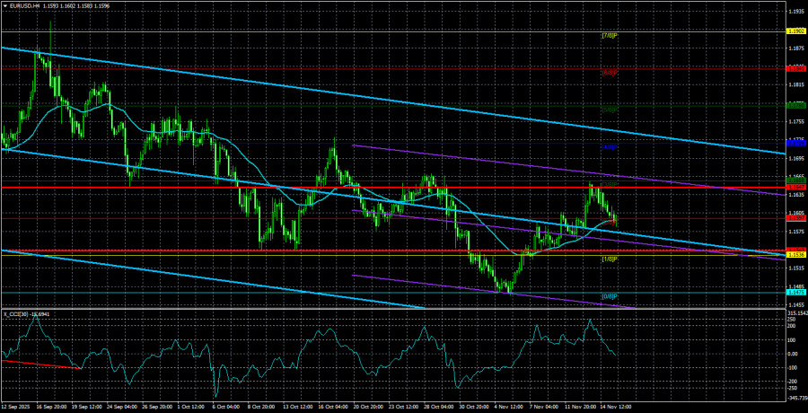 Валютная пара EUR/USD в течение понедельника продолжала торговаться с низкой волатильностью и полным отсутствием желания двигаться в одну из сторон. В целом, мы уже несколько недель подряд обращаем внимание трейдеров на несколько очень важных технических моментов. Может показаться, что мы совершенно забыли про макроэкономический или фундаментальный фон, но это не так. Давайте разбираться, почему. Во-первых, фундаментальный фон игнорируется рынком уже полтора месяца. Напомним, что доллар показал рост на 300 пунктов в период действия «шатдауна» в США. И преспокойно продолжил(начатое ранее) падение, когда «шатдаун» в США официально завершился. Помимо этого, в тот же период времени доллар рос при смягчении монетарной политики ФРС, а сейчас, когда ФРС практически отказалась от снижения ставки в декабре, спокойно падает. Также не стоит забывать о пошлинах Дональда Трампа. Последний пакет он ввел в начале октября, когда под тарифы попал весь импорт грузовиков, медикаментов и мебели. А чуть позже пошлины для Индии поднялись до 50%. Все это не мешало доллару расти весь октябрь-месяц. Таким образом, мы можем сказать, что фундаментальный фон не воспринимается рынком в данное время. Во-вторых, наиболее важный макроэкономический фон в данное время отсутствует. Экономические данные из Евросоюза(по инфляции или безработице), конечно, важны, но американская статистика всегда стояла для трейдеров на первом месте. Более того, ЕЦБ фактически завершил цикл смягчения монетарной политики, поэтому внимание рынка обращено на ФРС. А решения ФРС зависят от макроэкономических данных, которых нет. Поэтому второстепенные отчеты, которые все же публикуются время от времени, иногда обращают на себя взоры трейдеров, но в целом макроэкономика тоже практически никакого влияния на движения пары не оказывает. Таким образом, остается только техника, и вот тут-то как раз все легко, просто и закономерно. Вновь и вновь отмечаем флэт на дневном ТФ, ибо именно из-за него мы наблюдаем те движения, которые наблюдаем. Пара EUR/USD торгуется в боковом канале 1,1400-1,1830 уже несколько месяцев, а внутри флэта ценовые колебания, как правило, рэндомные. Именно поэтому фундамент и макроэкономика не соответствуют движениям пары. Цена движется по классике внутри бокового канала – от одной его границы к другой. Буквально неделю назад цена опускалась до уровня 1,1470, то есть находилась около нижней границы флэта. Поэтому и произошел разворот наверх, а теперь мы наблюдаем уже рост пары. Напомним, что любое падение европейской валюты в данное время – это априори коррекция и априори не соответствует фундаменту и макроэкономике. А любой рост – полностью закономерный из-за глобальных факторов, которые остаются в действии. Флэт рано или поздно будет завершен, а начнется новый виток восходящего тренда 2025 года с небольшого движения. Поэтому мы не удивимся, если этот виток уже начался от уровня 1,1470. Пока это очень слабое движение внутри флэта, но «Москва не сразу строилась». Средняя волатильность валютной пары EUR/USD за последние 5 торговых дней по состоянию на 18 ноября составляет 52 пункта и характеризуется, как «средняя». Мы ожидаем движение пары между уровнями 1,1543 и 1,1647 во вторник. Старший канал линейной регрессии направлен вниз, сигнализируя о нисходящей тенденции, но по факту продолжается флэт на 
