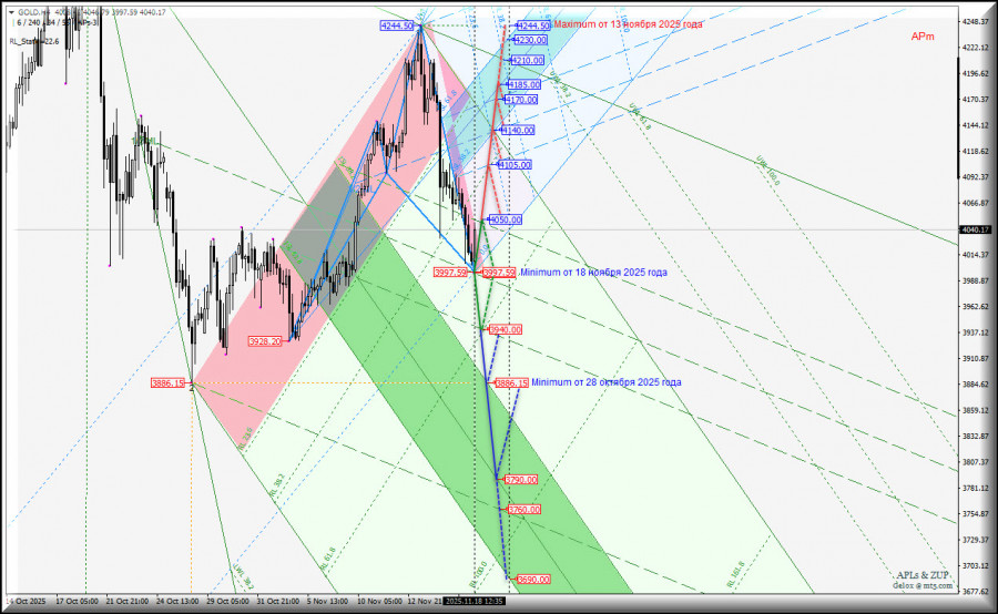Операционный масштаб Minute (таймфрейм h4)Основные технические уровни для торговли Spot GOLD - h4 - обзор вариантов движения c 18 ноября 2025 года.Предыдущий обзор GOLD (таймфрейм Daily ) от 11.11.2025 г. 12:09____________________Spot GOLDДвижение Spot GOLD - h4 с 18 ноября 2025 года продолжится в соответствии с отработкой и направлением пробоя границ канала 1/2 Median Line (3940.00 - 3997.59 (minimum от 18 ноября 2025 года) - 4050.00) нисходящих вил младшего операционного масштаба Minute-h4.Нисходящее движение:При пробое нижней границы канала 1/2 Median Line Minute-h4 (уровень поддержки 3940.00) нисходящее движение Spot GOLD может быть продолжено к границам зоны равновесия (3886.15 (minimum от 28 октября 2025 года) - 3790.00 - 3690.00) вил старшего операционного масштаба Minute-h4.Восходящее движение:Если случится пробой уровня сопротивления 4050.00 на верхней границе канала 1/2 Median Line вил старшего операционного масштаба Minute-h4 - тогда движение данного инструмента будет иметь восходящий характер и продолжится к границам канала 1/2 Median Line Minuette-h1 (4105.00 - 4140.00 - 4170.00) и зоны равновесия (4140.00 - 4185.00 - 4230.00) вил младшего операционного масштаба Minuette-h1.____________________Обзор составлен без учета новостного фона, открытия торговых сессий основных финансовых центров и не является руководством к действию (выставления ордеров "sell" или "buy").Больше аналитики на сайте InstaForex.ZUP и Вилы Эндрюса (термины, понятия, параметры).