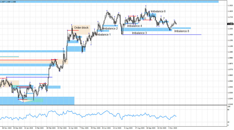 Пара получила реакцию от имбаланса 3, и это был очень важный сигнал, который остановил наступление медведей. Трейдеры получили возможность и основания для открытия сделок на покупку. Чуть позже был образован новый «бычий» имбаланс 8 и теперь этот паттерн теперь выступает зоной поддержки для цены, а также зоной интереса быков. Коррекционного отката мы пока не увидели, но в целом, он и не сильно нужен, так как хорошую разворотную модель и сигнал цена образовала. Информационный фон во вторник отсутствовал, поэтому рассчитывать на сильные атаки быков или медведей в начале новой недели не приходилось. Однако завтра вечером будет опубликован протокол «минутки ФРС», в четверг выйдут сентябрьские отчеты по безработице и рынку труда в США, а в пятницу станут известны индексы деловой активности в Германии, Евросоюзе и США. Все говорит о том, что вторая половина недели будет гораздо интереснее первой. Причин у быков для нового наступления имеется в достатке уже больше месяца, и все они сохраняют свою актуальность. Это и «голубиные» (в любом случае) перспективы ДКП FOMC, это и общая политика Дональда Трампа (которая не поменялась за последнее время), это и противостояние США с Китаем (где наступило лишь временное перемирие), это и акции протеста против Трампа (захлестнувшие Америку уже три раза в текущем году), это и слабость рынка труда, это и не радужные перспективы американской экономики (рецессия), это и «шатдаун» (который длился больше месяца, но явно не был учтен трейдерами). Таким образом, дальнейший рост пары, на мой взгляд, будет полностью закономерным. Не следует также упускать из виду торговую войну Трампа и его давление на FOMC. В данное время Трамп активно требует от Китая и Индии отказа от российской нефти в рамках компании по завершению войны в Украине. Против Индии Трамп повысил пошлины до 50%, а с Китаем вроде бы достигнуты некоторые договоренности, но всего лишь на один год. Новая эскалация – это вопрос времени. Вряд ли такой информационный плацдарм способствует «медвежьему» тренду. В «медвежий» тренд я по-прежнему не верю. Информационный фон по-прежнему крайне сложно интерпретировать в пользу доллара, поэтому я и не пытаюсь это делать. Синяя линия показывает ценовой уровень, ниже которого можно будет считать «бычий» тренд завершенным. До него медведям нужно пройти вниз еще около 240 пипсов. Ближайшей целью для роста европейской валюты остается «медвежий» имбаланс 1,1976 – 1,2092 на недельном графике, который был образован еще в июне 2021 года. Календарь новостей для США и Евросоюза: Евросоюз – Индекс потребительских цен (10-00 UTC). США – Протокол заседания ФРС (19-00 UTC). 19 ноября календарь экономических событий содержит в себе две записи, лишь одну из которых можно считать условно-важной. Влияние информационного фона на настроение рынка в среду может быть очень слабым или отсутствовать. Прогноз по EUR/USD и советы трейдерам: На мой взгляд, пара может находиться на завершающем этапе «бычьего» тренда. Несмотря на то, что информационный фон остается на стороне быков, атаковали в последнее время только медведи. И они по-прежнему находятся на грани слома «бычьего» тренда. Но все же реалистичных причин для начала «медвежьего» тренда я сейчас не вижу. От имбалансов 1, 2, 4 и 5 трейдеры имели возможность покупать евровалюту. Во всех случаях мы увидели опред