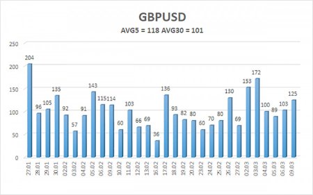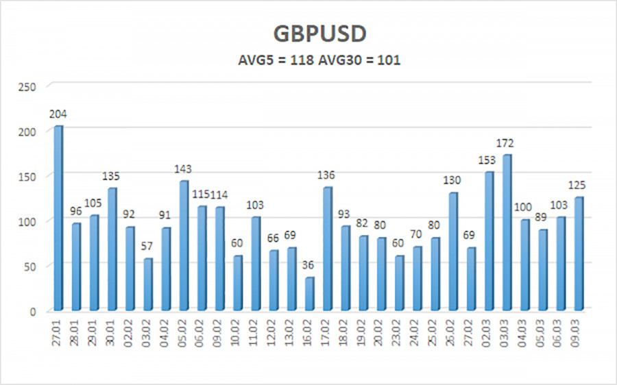 Валютная пара GBP/USD сохраняет нисходящую тенденцию на 4-часовом ТФ, хотя под самый занавес прошлой недели британский фунт все же начал немного расти. Рост британского фунта в конце прошлой недели оказался до смешного слабым, учитывая макроэкономическую статистику в США по рынку труда и безработице. Скажем просто: если бы доллар рухнул на 100-150 пунктов после отчетов NonFarm Payrolls и уровень безработицы, это был бы самый закономерный вариант. Однако рынок еще в пятницу не спешил избавляться от безопасного доллара, так как конфликт в Иране разгорается с течением времени все сильнее. Дональд Трамп заговорил на этих выходных о возможном проведении наземной операции в Иране. И хоть на данный момент Вашингтон стремится выполнить поставленные цели путем «ударов издалека», многие военные эксперты считают, что это невозможно. Таким образом, либо цели военной операции Трампа совершенно иные, либо озвученных целей добиться не удастся, но Трамп все равно объявит о полной победе, как было прошлым летом после ударов по трем ядерным объектам Ирана. Тогда Трамп сообщил об их полном уничтожении, а сейчас начал целую войну, чтобы снова уничтожить ядерные объекты. Однако, на наш взгляд, нельзя теперь сосредотачиваться только на войне на Ближнем Востоке. Следует понимать, что это далеко не первый и не последний конфликт в мире, далеко не первая и не последняя война за энергоресурсы и сферы влияния. Мир научился жить в условиях постоянной геополитической напряженности. Если нынешний рост цен на нефть, газ и топливо парализует половину экономик мира, то кто в этом виноват? На Ближнем Востоке, который является одним из крупнейших поставщиков энергоресурсов, никогда не стреляли? Это супер-безопасный регион, в котором всегда мир, тишь да гладь? Так или иначе, но из-за ухудшения ситуации на энергетическом рынке и отсутствия деэскалации конфликта в Иране началась новая неделя с нового роста американской валюты. На этот раз пара GBP/USD уже не опускалась ниже предыдущего локального минимума, что все-таки дает надежду на восстановление. Мы считаем, что на валютном рынке уже учтены наиболее негативные последствия и варианты развития событий, поэтому доллар находится на грани исчерпания позитивного фундамента. Напомним, что такого сильного падения британского фунта в последний месяц вполне могло и не быть. Да, с Туманного Альбиона неоднократно поступали разочаровывающие данные, но и из Штатов негативный поток новостей не прекращается. Таким образом, даже после падения пары на 550 пунктов, мы не считаем, что восходящий тренд на дневном ТФ завершен. Кстати, на дневном ТФ цена отработала линию Сенкоу Спан Б и в течение пяти дней не сумела ее преодолеть. Поэтому вполне возможно, что на этом падение британской валюты и завершится. Конечно, мы не знаем будущего, не знаем, что дальше будет происходить в Иране, на какие еще страны распространится иранская война и так далее. Говорить сейчас о невозможности дальнейшего роста доллара было бы непрофессионально. Однако на текущий момент складывается впечатление, что «банкет» в честь доллара окончен. Средняя волатильность пары GBP/USD за последние 5 торговых дней составляет 118 пунктов. Для пары фунт/доллар это значение является «высоким». Во вторник, 10 марта, таким образом, мы ожидаем движения внутри диапазона, ограниченного уровня