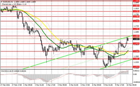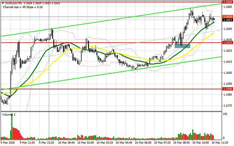 В своем утреннем прогнозе я обращал внимание на уровень 1.1632 и планировал от него принимать решения по входу в рынок. Давайте посмотрим на 5-минутный график и разберемся с тем, что там произошло. Прорыв и обратный тест 1.1632 привели к точке входа на покупку евро, что вылилось в рост пары более чем на 30 пунктов. На вторую половину дня техническая картина не пересматривалась.Для открытия длинных позиций по EURUSD требуется:Заявления Трампа о скором окончании войны с Ираном продолжили рост европейской валюты сегодня в первой половине дня. Более-менее позитивная статистика по сальдо торгового баланса Германии также поддержала евро. Во второй половине дня ожидаются цифры по индикатору оптимизма в сфере малого предпринимательства от NFIB, объему продаж жилья на вторичном рынке США и еженедельные показатели по изменению занятости от ADP. При сильных показателях пара EUR/USD может продемонстрировать и некоторое снижение. Действовать в таком случае буду только после теста и формирования ложного пробоя в районе новой поддержки 1.1630, образованной по итогам сегодняшнего дня. Это даст точку входа в длинные позиции в расчете на восстановление евро к уровню 1.1669, до теста которого в первой половине дня мы так и не дотянули. Прорыв и обратный тест этого диапазона сверху вниз по аналогии с тем, что я разбирал выше, станут подтверждением правильной точки вход с движением к области 1.1705. Самой дальней целью будет уровень 1.1745, где буду фиксировать прибыль. При варианте снижения EUR/USD и отсутствия активности в районе 1.1630, давление на евро вернется. Это приведет к снижению в район минимума 1.1590. Лишь после формирования там ложного пробоя собираюсь действовать на покупку евро. Открывать длинные позиции сразу на отскок планирую от 1.1551 с целью восходящей коррекции в 30-35 пунктов внутри дня.Для открытия коротких позиций по EURUSD требуется: Продавцы пока сохраняют осторожность, так как одно дело сказать, а другое – сделать. Это, что касается вчерашних заявлений Трампа. В любой момент он может сказать, что новое руководство Ирана его не устраивает, что приведет к эскалации конфликта, который, по сути, никуда и не делся. Так что продавцы проявят себя при любой возможности. В случае еще одного роста EUR/USD, основной задачей медведей на вторую половину дня будет защита сопротивления 1.1669. Формирование там ложного пробоя будет точкой входа в короткие позиции с целью снижения к уровню 1.1630. Прорыв и закрепление ниже этого диапазона станут подходящим вариантом на продажу уже с движением в район 1.1590, где ожидаю более активного проявления покупателей. Там же проходят и средние скользящие, играющие на стороне быков. Самой дальней целью выступит минимум 1.1551, где буду фиксировать прибыль. В случае движения вверх EUR/USD, а также отсутствия активных действий медведей в районе 1.1669, все это откроет дорогу к уровню 1.1705. Продавать там буду только после неудачного закрепления. Открывать короткие позиции сразу на отскок я планирую от 1.1745 с целью нисходящей коррекции в 30-35 пунктов.Рекомендую ознакомиться:В COT-отчете (Commitment of Traders) за 3 марта наблюдалось сокращение длинных позиций и резкий рост коротких. Учитывая войну США и Израиля с Ираном, нет ничего удивительно, что в этом отчете отмечен резкий рост коротких позиций по евро. Однако ситуация на Ближнем востоке так стремительно меняется, что в нас