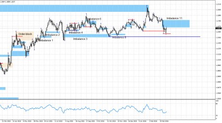 Пара EUR/USD находится на очередной для себя развилке. Вкратце перечислю основные технические моменты. Пара произвела съем ликвидности на покупку на прошлой неделе, произвела съем ликвидности на покупку на этой неделе, выполнила точечную отработку имбаланса 11, а еще буквально небольшое падение котировок приведет к отмене «бычьего» тренда. Таким образом, в ближайшее время либо имбаланс 11 должен быть инвалидирован, и тогда будет возобновлен «бычий» тренд, что является наиболее предпочтительным вариантом. Либо же «бычий» тренд будет сломан. На самом деле существует и еще несколько возможных вариантов развития событий, но на текущий момент эти самые очевидные.