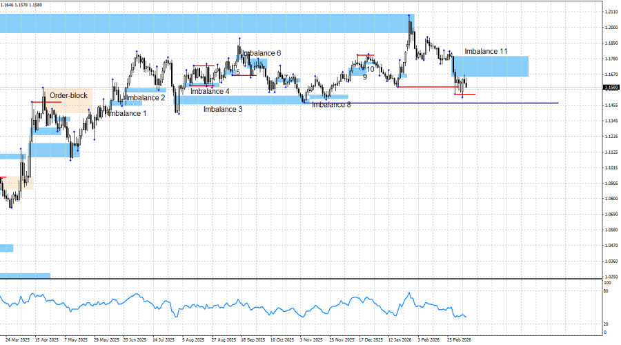 На мой взгляд, без новой эскалации конфликта на Ближнем Востоке доллару будет крайне сложно продолжать рост, а медведям – продолжать наступление. Однако ситуация на Ближнем Востоке, если не разгорается еще больше, то и лучше не становится. Вчера стало известно, что Иран нанес удары по нескольким танкерам, подтвердив свои намерения заблокировать проход через Ормузский пролив делом. Безусловно, теперь Дональд Трамп может нанести новые удары по Ирану, только что они изменят? Американские ракеты могут уничтожить нового лидера Хаменеи, но уже на следующий день его место займет другой человек с теми же антиамериканскими взглядами. На прошлой неделе, как и предполагалось, был образован «медвежий» имбаланс 11, а на этой неделе он был отработан. Сигнал на продажу образовался достаточно быстро под давлением геополитического фона. Теперь быки могут рассчитывать лишь на новые съемы ликвидности с последних трех лоу: 1,1508, 1,1470 и 1,1392. Но если геополитика не станет лучше, то и это не спасет быков. Графическая картина пока продолжает сигнализировать о «бычьей» доминации. «Бычий» тренд сохраняется, однако в данное время трейдеры-быки не имеют достаточно причин для нового наступления. Чтобы ожидать рост европейской валюты, война в Иране должна пойти на спад, цена на нефть и газ должна продолжать снижаться. Чтобы открывать новые сделки на покупку, нужны новые «бычьи» паттерны или хотя бы съем ликвидности с трех последних «медвежьих» свингов. Информационный фон в среду был достаточно интересным, но на него практически никто не обратил внимания. Отчет по инфляции в Германии не заинтересовал трейдеров, а отчет по инфляции в США заинтересовал, но лишь на очень короткий срок. Причин у быков в последние месяцы атаковать было огромное количество, и даже с началом войны на Ближнем Востоке их меньше не стало. Структурно и глобально политика Трампа, которая привела к серьезному падению доллара в прошлом году, не поменялась. В ближайшее время американская валюта может демонстрировать рост на фоне бегства инвесторов от риска, но этот фактор не сможет оказывать ей поддержку постоянно. А вот «голубиные» перспективы ДКП FOMC, торговую войну Трампа со всем миром, слабость американского рынка труда, два «шатдауна», военную агрессию США, уголовное преследование Пауэлла, падение темпов роста ВВП и другие не очень приятные для Америки вещи конфликт в Иране не отменяет. В «медвежий» тренд я по-прежнему не верю. Доллар получил временную поддержку рынка, но не факт, что такая ситуация будет сохраняться долгое время. Синяя линия показывает ценовой уровень, ниже которого можно будет считать «бычий» тренд завершенным. До него медведям нужно пройти вниз около 120 пипсов, и даже если с этой задачей медведи справятся, я все равно буду сомневаться в «медвежьем» тренде. На мой взгляд, пара демонстрирует сильное падение только на факторе геополитики. Когда он перестанет действовать, за счет чего будут атаковать медведи? Календарь новостей для США и Евросоюза: США – Число полученных разрешений на строительство (12-30 UTC). США – Число начатых строительств новых домов (12-30 UTC). США – Число первичных обращений за пособиями по безработице (12-30 UTC). 12 марта календарь экономических событий содержит в себе три записи, ни одна из которых не считается важной. Влияние информационного фона на 