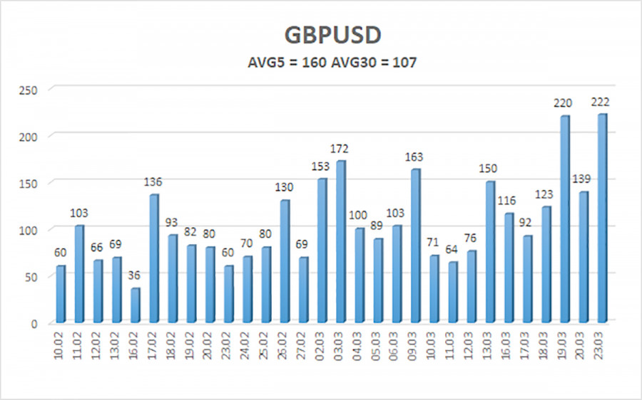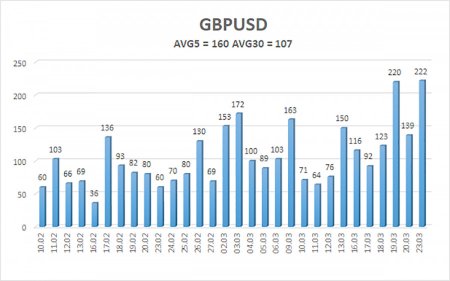 Валютная пара GBP/USD в понедельник также показала стремительный рост в течение дня, который был спровоцирован, конечно же, Дональдом Трампом. Следует отметить, что никаких важных событий и публикаций на этот день запланировано не было, поэтому только Трамп мог в очередной раз раскачать рынки. Правда, американский президент постоянно забывает, что сейчас – не каменный век, и любое его ложные заявление опровергается в течение следующих 10 минут. Подумайте, если переговоры с Ираном действительно ведутся, зачем Тегерану отвергать факт их существования? Вывод? Никаких переговоров нет и не предвидится в ближайшее время, о чем прямо заявили официальные лица Ирана. Также в сообщении говорилось, что Ормузский пролив останется заблокированным, а Иран будет защищать все свои территории и отвечать на каждый удар. На наш взгляд, это тотальное поражение лично Дональда Трампа, но на этой неделе мы, вероятно, услышим о полной победе над Ираном, уничтожении всего ядерного запаса и объектов в Иране, а также об урегулировании еще одной войны «американским миротворцем». Зачем это вообще нужно? Напомним, что в Америке на носу выборы. Политические рейтинги Трампа летят в пропасть, американские избиратели не понимают, зачем вообще нужна была война в Иране, а эксперты в один голос трубят, что весь конфликт был начат лишь для того, чтобы отвести внимание общественности от скандала, связанным с файлами Эпштейна, в которых имя Трампа фигурирует несколько тысяч раз. Поражение Республиканской партии на выборах уже практически гарантированно, но поражения тоже бывают разными. На данный момент эксперты уверены в том, что республиканцы потеряют Палату представителей. Это неприятно, но не критично. Да, республиканцам теперь придется договариваться с демократами по некоторым вопросам, но последнее слово будет оставаться все равно за ними. Однако, если война в Иране будет продолжаться(а она, похоже, будет продолжаться, даже если Трамп объявит о полной победе), республиканцы могут потерять даже Сенат. Это маловероятно, но 6 лет назад американцы были готовы голосовать за кого угодно, кроме Трампа. Даже за супермена. А сейчас экономика США замедляется и в целом растет слабее, чем в период Байдена, рынок труда летит в пропасть, американцы теряют работу, не могут найти работу, экономический рост 2025 года был обеспечен лишь инвестициями в ИИ-сектор и торговыми пошлинами. Кстати, торговые пошлины – это отдельная история. Сейчас, вероятно, уже каждое американское домохозяйство осознает, что Трамп просто обокрал их на тысячи долларов, заставив заплатить за импортные товары, что было полностью незаконным. Однако возвращать деньги американское правительство не спешит. В общем, сейчас Трампу нужно в очередной раз сделать хорошую мину при плохой игре и снять напряжение, вокруг собственного имени. Поэтому лидер Белого дома и старается всеми силами сделать вид, что война на Ближнем Востоке скоро закончится. Правда, ему никто не верит и вряд ли поверит. Средняя волатильность пары GBP/USD за последние 5 торговых дней составляет 160 пунктов. Для пары фунт/доллар это значение является «высоким». Во вторник, 24 марта, таким образом, мы ожидаем движения внутри диапазона, ограниченного уровнями 1,3242 и 1,3562. Старший канал линейной регрессии развернулся вбок, что указывает на разворот тренда.