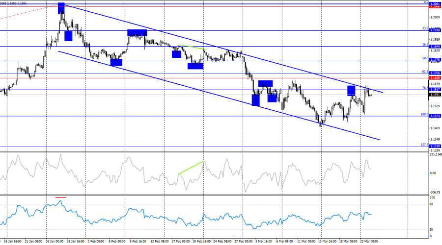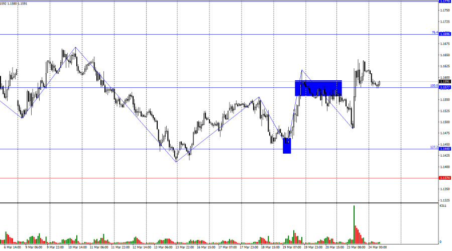 Ситуация с волнами на часовом графике остается понятной. Последняя завершенная волна вниз не пробила лоу предыдущей волны, а последняя волна вверх пробила предыдущий пик. Таким образом, тренд в данное время может вновь меняться на «бычий». Действия Дональда Трампа на Ближнем Востоке спровоцировали в регионе масштабные военные действия с участием десятка государств, которые позволяли доллару показывать рост, как «валюты-убежища». Однако на этой неделе Вашингтон встал на путь примирения, что оказывает давление на доллар. В понедельник экономические публикации в календарях событий не значились, однако исправил ситуацию Дональд Трамп, который неожиданно сообщил о продуктивных переговорах с Ираном, из-за чего он переносит свое решение о нанесении ударов по энергетической инфраструктуре на 5 дней. В Иране тут же опровергли заявление американского президента, однако рынок расценил это событие, как первые шаги на пути к завершению конфликта. Согласно различным инсайдам, переговоров между Тегераном и Вашингтоном еще не было, но они планируются в ближайшее время. Сложно сказать, чем и как они завершатся, но все же это лучше, чем ничего. Рынкам ничего другого не остается, как верить в лучшее. Безусловно, трейдерам в целом неважно, в какую сторону движется та или иная пара, но я думаю все будут рады, если война на Ближнем Востоке завершится, а цены на энергоносители снизятся. Таким образом, остается ждать новых заявлений от Тегерана и Вашингтона, надеяться на переговоры и мир. Чем больше рынок будет получать сигналов о возможности завершения войны, тем сильнее будут отступать медведи и падать доллар. Американская валюта в последние недели демонстрировала рост только на факторе геополитики. Сейчас этот фактор начинает разворачиваться против доллара.