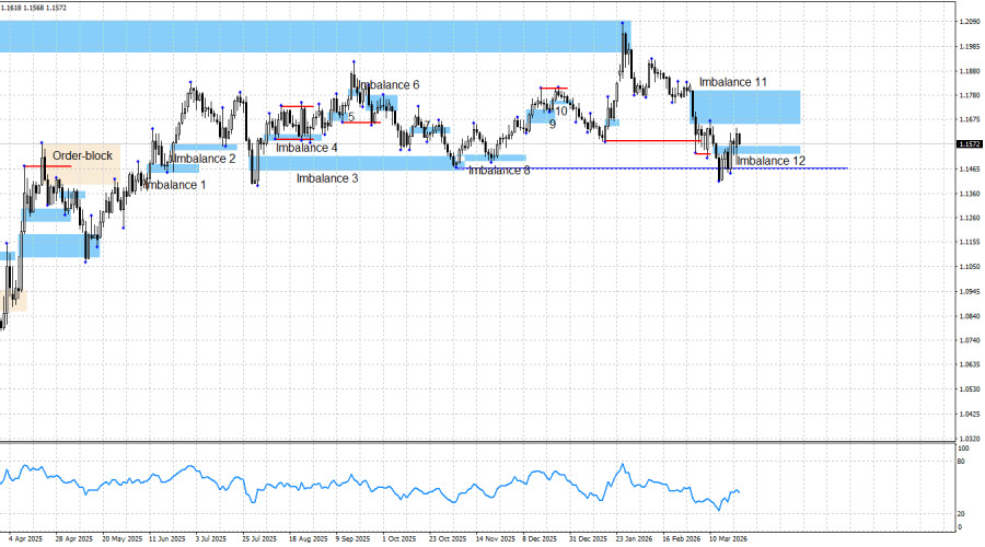 Весь рост американской валюты в последние 4-5 недель был обеспечен геополитикой. Именно поэтому я неоднократно говорил, что не верю в завершение «бычьего» тренда, несмотря на пробой важных, трендообразующих лоу. В данное время все идет к тому, что имбаланс 12 будет инвалидирован, а инвалидация «медвежьего» паттерна – это первый признак смены настроения трейдеров. Безусловно, остается еще имбаланс 11, тоже «медвежий», на который цена может среагировать. Да и война на Ближнем Востоке еще не завершилась. Торги в понедельник показали – быки могут атаковать, но им нужно нечто большее, чем обещания Трампа. В продолжение падения я смогу поверить лишь в том случае, если геополитика и дальше будет оказывать серьезную поддержку медведям. А, как я уже говорил, для этого требуется, чтобы ситуация на Ближнем Востоке не просто оставалась сложной, а чтобы она становилась еще хуже. Куда еще хуже, чем сейчас? Нефть должна продолжать расти в цене, в конфликт на Ближнем Востоке должны вступать новые государства, экономики развитых стран мира должны в буквальном смысле слова страдать в течение долгого времени. А сам конфликт должен растянуться на долгие месяцы. Ранее я говорил, что предпосылок для такого сценария я не вижу, но позитивных вестей с Ближнего Востока поступает крайне мало. Ситуация может вспыхнуть с новыми силами в любой момент. Новых паттернов для открытия позиций в данное время нет. В ближайшее время может быть отработан имбаланс 11, и в случае реакции цены на этот паттерн, процесс падения может быть возобновлен с целями ниже 1,1400. Однако для этого требуется поддержка геополитики. Если рынок переключит внимание на стандартный экономический фон, то на прошлой неделе ЕЦБ и Банк Англии создали плацдарм для роста евро и фунта в виде готовности к ужесточению ДКП. Но пока трейдеров больше интересует Ормуз и Иран. Графическая картина пока еще продолжает сигнализировать о «бычьей» доминации. «Бычий» тренд остается в силе, однако в данное время трейдеры-быки остаются в незавидном положении из-за резко изменившегося информационного потока. Чтобы открывать новые сделки на покупку, нужны новые «бычьи» паттерны или хотя бы съем ликвидности с двух последних «медвежьих» свингов. Съем ликвидности мы увидели, но он не является паттерном, по нему нельзя открывать торговые сделки. Информационный фон во вторник оказался противоречивым для европейской валюты, так как индексы деловой активности в секторах производства Германии и Евросоюза выросли сильнее ожиданий рынка, а индексы секторов услуг упали сильнее прогнозов. Таким образом, поддержку не получили ни быки, ни медведи. Причин у быков атаковать остается огромное количество, и даже с началом войны на Ближнем Востоке их меньше не стало. Структурно и глобально политика Трампа, которая привела к серьезному падению доллара в прошлом году, не поменялась. В ближайшее время американская валюта может демонстрировать рост на фоне бегства инвесторов от риска, но этот фактор не сможет оказывать ей поддержку постоянно. А других факторов поддержки у американской валюты нет. В «медвежий» тренд я по-прежнему не верю. Доллар получил временную поддержку рынка, но не факт, что такая ситуация будет сохраняться долгое время. Однако «бычий» тренд сломлен, и это следует признать, как это ни печально. Есть еще шанс на 