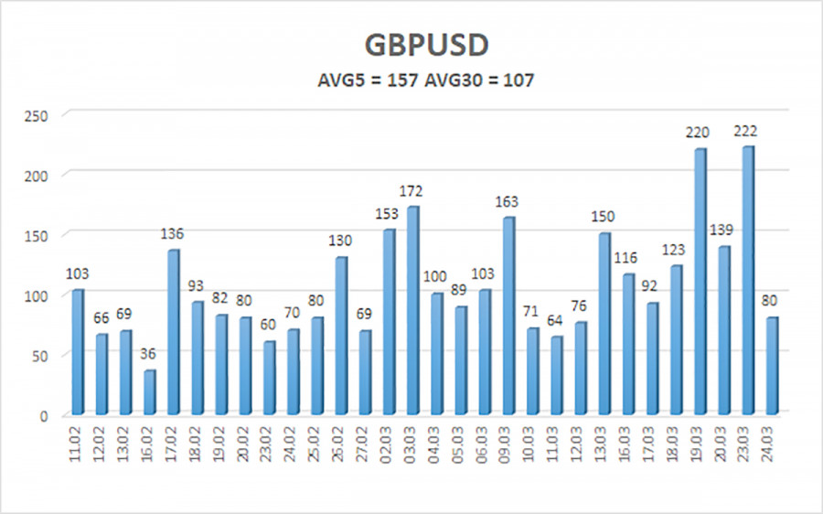 Валютная пара GBP/USD во вторник продолжала торговаться в ограниченном ценовом диапазоне, а движения пары в последнюю неделю больше всего похожи на качели. Фунт стерлингов уже больше недели не может выбраться из диапазона 1,3250-1,3464. Вряд ли последние движения на рынке можно считать флэтом или случайностью. На этот раз фундаментальные и геополитические события действительно провоцировали постоянную смену настроения рынка. Поэтому рост британского фунта в понедельник не значит фактически ничего. «Ястребиные» результаты заседания Банка Англии не значат практически ничего. Намеки европейских регуляторов на повышение ключевых ставок в текущем году не значат ничего. Отказ ФРС от смягчения политики, по меньшей мере, до конца года – не значит ничего. Всё будет зависеть от того, когда и как завершится конфликт на Ближнем Востоке, когда будет разблокирован Ормузский пролив. Если война закончится завтра(а с Трампом нельзя исключать и этот вариант), инфляция попросту не успеет разогнаться до значений, требующих «ястребиного» вмешательства центральных банков. Если война будет длиться годами(что тоже нельзя исключать), ФРС может последовать примеру ЕЦБ и Банка Англии. На наш взгляд, политика Трампа полностью заключается в том, что выгодно лично американскому президенту. Дональд Трамп имеет в своей жизни все, поэтому на старости лет его может интересовать лишь власть и внесение собственного имени в историю США. Именно поэтому Трамп так страстно желал получить Нобелевскую премию мира, именно поэтому Трамп «завершил уже с десяток войн по всему свету». Лидер-республиканец хочет как можно чаще фигурировать в исторических событиях мирового масштаба, хочет, чтобы его считали лучшим или хотя бы одним из лучших президентов в истории США. Таким образом, делать Трамп будет то, что выгодно лично ему, а не Америке. Что же выгодно сейчас хозяину Белого дома? Трампу выгодно завершить войну, заявив о полной победе на Ираном и об уничтожении всего ядерного потенциала арабской страны. Тогда его имя будет внесено в учебники по истории, а в каком-нибудь американском городке может быть появится даже еще один памятник «человеку, предотвратившему ядерный удар по США». Если конфликт с Ираном будет продолжаться, о смягчении монетарной политики можно забыть. И даже Кевин Уорш не изменит ситуацию, так как их голосов со Стивеном Мирраном не хватит для склонения чаши весов в свою пользу. А Трампу нужны «беспрецедентные темпы роста экономики», о которых мы знаем пока только по заявлениям самого президента США. В данное время американская экономика растет темпами ниже, чем при Джо Байдене, который ни с кем не воевал, никого из Штатов не выгонял, ни с кем не судился, не вводил торговые пошлины и не наседал на ФРС. Таким образом, экономические результаты США при Трампе на данный момент крайне скудные. Американцы, хоть и наступили на грабли уже во второй раз, вряд ли сделают это в третий. Средняя волатильность пары GBP/USD за последние 5 торговых дней составляет 157 пунктов. Для пары фунт/доллар это значение является «высоким». В среду, 25 марта, таким образом, мы ожидаем движения внутри диапазона, ограниченного уровнями 1,3231 и 1,3545. Старший канал линейной регрессии развернулся вбок, что указывает на разворот тренда. Индикатор CCI заходил в область перепроданности дважды, что еще 