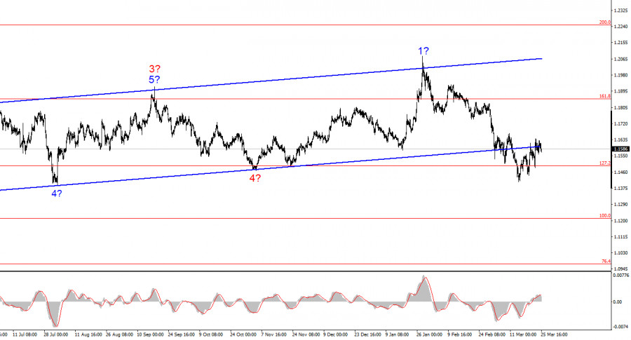Курс инструмента EUR/USD в течение среды снизился на 30 базовых пунктов, что никакого влияния на волновую разметку инструмента не оказало. Новостной фон сегодня был достаточно слабым, а наиболее важным событием дня стал отчет по британской инфляции, которая тоже ничем не удивила участников рынка. Поэтому курс инструмента GBP/USD тоже практически не изменился в течение дня и не повлиял на инструмент EUR/USD, как мог бы. Интересные события разворачиваются вокруг ирано-американской войны. Если несколько недель назад многие аналитики считали, что Трамп нанесет удары по Ирану, как прошлым летом, и на этом все завершится, то сейчас мир готовится к затяжному конфликту на Ближнем Востоке. В Вашингтоне рассчитывали, что после серии уничтожающих инфраструктуру ударов Тегеран сдастся и примет условия Трампа, а по факту через три недели сам Трамп не знает, как заключить перемирие с Ираном. Сегодня поступила информация о том, что Вашингтон направил в Иран проект соглашения, состоящий из 15 пунктов. А чуть позже Иран уже во второй раз на этой неделе отверг предложение о переговорах. Тем временем, Израиль собирается продолжать бомбить Иран, несмотря на любые переговоры между США и Ираном, а Вашингтон начал переброску сухопутных войск в регион конфликта. И как понять, война идет к переговорам и завершению или же к новой эскалации? Обстановка на Ближнем Востоке остается неопределенной, поэтому рынок не спешит с торговыми решениями. Мы наблюдаем построение коррекционного набора волн, потому что сейчас – удачное время для коррекции: нет ни эскалации, ни деэскалации. Но коррекция не может продолжаться вечно, а Дональд Трамп не сможет просто забыть об Иране.Общие выводы
