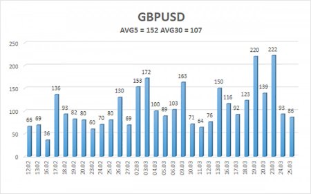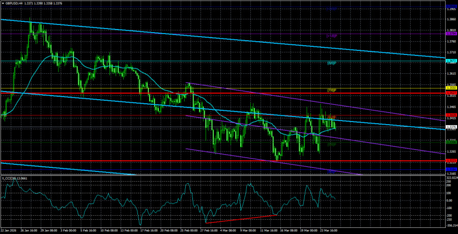 Валютная пара GBP/USD в среду также торговалась достаточно спокойно и даже на важный отчет по инфляции в Великобритании и официальные заявления Ирана никак не отреагировала. Вчера мы предупреждали, что отчеты по инфляции в текущих обстоятельствах приобретают совершенной новый уровень значимости, но в то же время отчеты, начиная с марта-месяца, когда конфликт на Ближнем Востоке уже начался, а цены на нефть и газ полетели в космос. Февральская инфляция сейчас мало кого интересует. Поэтому трейдеры не посчитали нужным отработать минимальный рост базовой инфляции на Туманном Альбионе. Примерно тоже самое касается и официального заявления иранских властей. Тегеран сообщил, что в данное время никаких переговоров с США не ведется, и более того – они нецелесообразны. Представители Ирана сообщили, что мир может забыть о низких ценах на нефть и газ до тех пор, пока позиция Ирана и его суверенитет не будет уважаться, как минимум, Америкой. Проще говоря, Тегеран старается создать такие условия, при которых весь мир ополчится против Дональда Трампа и США. Ведь это Америка начала войну на Ближнем Востоке. А теперь весь мир пожинает плоды геополитических амбиций Трампа. Поэтому, если мир хочет разблокировки Ормузского пролива, то должен что-то сделать с позицией Вашингтона. Если же нет, то Иран и дальше будет блокировать Ормузский пролив для всех суден недружественных государств. Мы, конечно, не знаем, какое предложение направил Дональд Трамп Тегерану через Пакистан, но уже сейчас ясно – вероятность достижения мирного соглашения стремится к нулю. Иран подвергается трехнедельной бомбардировке, но по мановению волшебной палочки должен завершить войну? Тегеран, в отличие от Вашингтона и многих других экономически более развитых государств, готов воевать долгие годы. Стране нечего терять. Уровень жизни иранцев десятилетиями сохраняется на отметке «ниже плинтуса». Америке и ее союзникам не удастся понизить его еще сильнее, чтобы спровоцировать народное ополчение против действующей власти. Все разбомбленные и уничтоженные объекты будут восстановлены со временем. Главное – Иран не уступил ни одного квадратного сантиметра собственной земли, а все остальное – решаемо. Поэтому это именно Штатам и Европе нужно активно думать, как вывести Иран на переговоры. А Иран теперь занимает доминирующую позицию. Теперь его нужно убедить пойти на мирные переговоры, а на переговорах – предложить что-то, от чего невозможно отказаться. Пойдет ли на такой сценарий Дональд Трамп и пассивная Европа? На наш взгляд, нет. Дональд Трамп должен уступить и закрыть глаза на ядерную программу Ирана, что вряд ли возможно. Иначе как президент США объяснит своему народу, зачем вообще нужна была война в на Ближнем Востоке? На Европу тоже рассчитывать не приходится. Она уже давно занимает позицию «делайте, что хотите, только нас в это не втягивайте». Поэтому, похоже, нас ждет затяжной конфликт, который будет еще очень долго поддерживать цены на энергоносители на максимальном уровне. Средняя волатильность пары GBP/USD за последние 5 торговых дней составляет 152 пункта. Для пары фунт/доллар это значение является «высоким». В четверг, 26 марта, таким образом, мы ожидаем движения внутри диапазона, ограниченного уровнями 1,3223 и 1,3527. Старший канал линейной регрессии развернулся вниз, ч