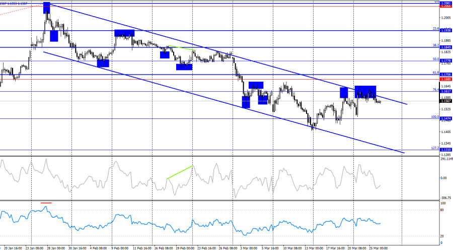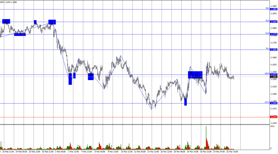 Ситуация с волнами на часовом графике остается понятной. Последняя завершенная волна вниз не пробила лоу предыдущей волны, а последняя волна вверх пробила предыдущий пик. Таким образом, тренд в данное время продолжает меняться на «бычий». Действия Дональда Трампа на Ближнем Востоке спровоцировали в регионе масштабные военные действия с участием десятка государств, которые позволяют доллару рассчитывать на дальнейший рост. В среду экономических публикаций было мало, и трейдеры не нашли в них ничего интересного для себя. Все их внимание по-прежнему сосредоточено на Иране и США. И, надо сказать, сигналы из Америки и Ближнего Востока поступают обильно, но носят противоречивый характер. Всю текущую неделю Трамп постоянно делает заявления о том, что уже в ближайшее время Вашингтон и Тегеран заключат сделку. А если не заключат, то, по крайней мере, начнут переговоры. Трейдеры поверили Трампу в понедельник, но затем несколько заявлений высокопоставленных чиновников Ирана полностью развеяли все надежды на мирное будущее. Тегеран напрочь отверг любые переговоры, попутно сообщив, что Вашингтон ведет переговоры сам собой. А параллельно готовится к новой военной операции с использованием десанта. Америка действительно допускает возможность проведения наземной операции, а аналитики также отмечают, что целью операции может стать остров Харг, через который экспортируется почти вся иранская нефть. Стоит напомнить, что сам Иран продолжает продавать нефть Китаю и другим азиатским странам. Таким образом, атака на остров Харг может ставить перед собой цель полностью отрезать Иран от финансовых поступлений за счет продажи энергоносителей. На мой взгляд, сигналы на этой неделе свидетельствуют о готовящейся новой эскалации конфликта, а не наоборот.