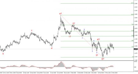 Волновая разметка 4-часового графика для инструмента EUR/USD видоизменилась. Об отмене повышательного участка тренда(нижняя картинка), который берет свое начало в январе прошлого года, речи по-прежнему не идет, однако теперь волновая структура тренда выглядит очень неоднозначно. В подобных ситуациях я всегда советую переходить на младший масштаб(верхняя картинка) и рассматривать самые простые и малые волновые структуры, чтобы иметь возможность сделать краткосрочный прогноз, чего вполне достаточно для открытия сделок. Волновые структуры могут быть очень сложными, которые предполагают множество различных сценариев. Проще всего торговать по стандартным «пять-три». На картинке выше я могу выделить классическую пятиволновую импульсную структуру волн с удлинением в третьей волне. Если это действительно так, то построение этой структуры завершено, а нас ожидает построение коррекционного набора минимум на три волны. Следовательно, в ближайшее время стоит ожидать повышения котировок инструмента, но уже в рамках коррекции относительно последнего участка тренда. Пока что последние волновые структуры очень плохо вписываются в старшую разметку, но со временем ситуация прояснится. В ближайшее время можно ожидать восстановления европейской валюты к отметкам 1,1666 и 1,1745.