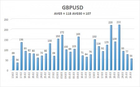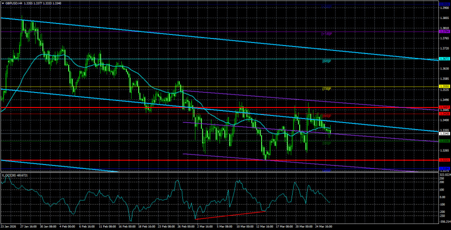 Валютная пара GBP/USD в четверг также торговалась с понижением. Нельзя сказать, что нисходящий тренд стопроцентно возобновлен, но пара GBP/USD вновь потихоньку сползает вниз. Если учесть тот факт, что в среду был опубликован отчет по инфляции в Великобритании, а в четверг вообще никаких важных публикаций не было, становится очевидно: рынок продолжает смотреть только в сторону Ближнего Востока, а все макроэкономические события игнорирует, как и раньше. А ведь именно фундамент и макроэкономика могли бы поддержать фунт на этой и на прошлой неделе. Напомним, что Банк Англии занял «ястребиную» позицию на последнем заседании, а ФРС – нейтральную. БА готов к повышению ставок, а ФРС – нет. В среду был опубликован отчет по британской инфляции, который показал небольшое ускорение базового показателя. Конечно, рынок ждет мартовских значений по потребительским ценам, готовится к существенному ускорению инфляции и еще большему ужесточению риторики со стороны Британского регулятора. Но даже небольшое повышение инфляции в феврале могло бы спровоцировать рост британской валюты. Что касается четверга, то оснований для падения пары GBP/USD вообще не было никаких, если не принимать в расчет геополитику. Вот и получается, что рынок продолжает игнорировать все факторы, которые выступают против доллара США, а отрабатывать – только геополитику, которая поддерживает доллар США руками и ногами. В целом, даже говорить сейчас больше не о чем, кроме геополитики. Можно перечислить заявления представителей ФРС, ЕЦБ и Банка Англии, которые вновь начали давать комментарии после заседаний на прошлой неделе. Но какой в этом смысл, если рынок не реагирует на эти заявления? Можно вспомнить, что рынок труда США остается в коме, американская экономика замедляется, в 2026-2027-х годах может наступить рецессия. Можно поговорить про выборы в ноябре текущего года, на которых партия Трампа проиграет с вероятностью 99,9%. Но и в этом особого смысла сейчас нет, потому что рынок отслеживает только геополитику. А геополитических новостей нет. Есть только слухи, инсайды(правдивость которых никак не проверишь) и откровенные «утки». И на основании этой абсолютно непроверенной, а временами и откровенно неправдивой информации рынок должен принимать торговые решения. На наш взгляд, трейдеры принимают абсолютно верное решение, не отпуская доллар далеко от себя. Если американская валюта вновь воспринимается всеми, как валюта-убежище, то какой смысл ее продавать, когда к берегам Ирана направляются американские десантники и пехотинцы? Что касается заявлений Дональда Трампа о переговорах и о перемирии, то... вчера лидер американской нации сообщил на пресс-конференции, что Иран предложил стать ему Верховным лидером. Трамп, конечно же, отказался, но призвал Тегеран как можно быстрее заключить сделку. Собственно, это все, что нужно знать о серьезности заявлений лидера Белого дома. Президент США остается верен себе: говорить можно все что угодно. Если потом уличат во лжи, то всегда можно сказать, что его неверно поняли. Средняя волатильность пары GBP/USD за последние 5 торговых дней составляет 118 пунктов. Для пары фунт/доллар это значение является «высоким». В пятницу, 27 марта, таким образом, мы ожидаем движения внутри диапазона, ограниченного уровнями 1,3221 и 1,3457. Старший канал линейной регрессии раз