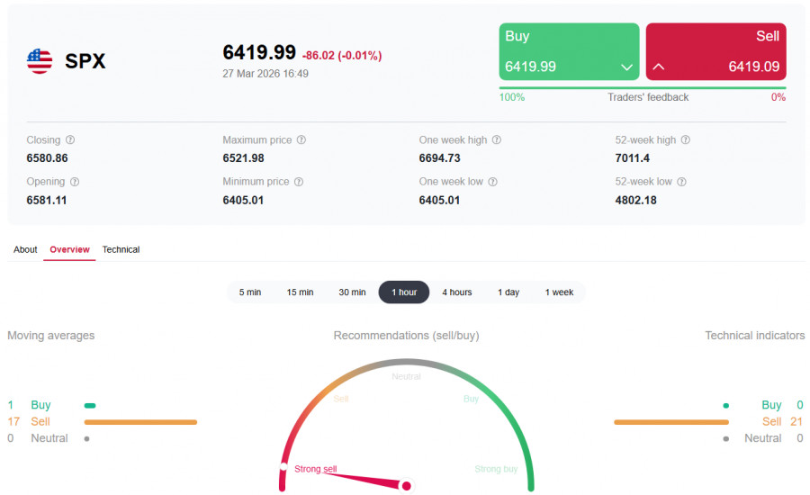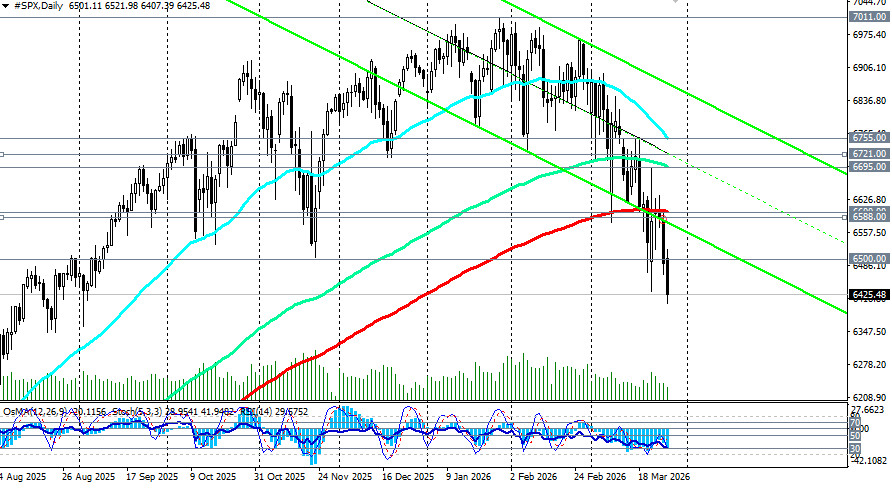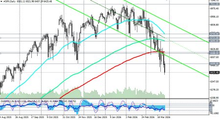 *см. также: Торговые индикаторы InstaForex по S&P500 (SPX)[/i] [i] Пятница, 27 марта 2026 года, стала очередным днем распродаж на американском фондовом рынке. Пробив важный уровень поддержки 6500.00, индекс S&P500 завершает неделю в зоне отметок 6430.00–6400.00, потеряв с начала конфликта в Иране 28 февраля более 7,5% от январских максимумов. Рынок оказался в эпицентре редкого сочетания факторов: эскалация ближневосточного конфликта, взрывной рост цен на нефть выше 100 долларов за баррель, ястребиная пауза ФРС и растущие стагфляционные риски. Фьючерсы на Dow Jones упали на 469 пунктов (1,.01%) утром в пятницу, S&P500 потерял 1,74%, а Nasdaq Composite рухнул на 2,38%, войдя в зону коррекции. Ключевые факторы давления: идеальный шторм1. Геополитическая неопределенность Надежды на деэскалацию, появившиеся в начале недели после заявлений Трампа о продлении срока переговоров до 6 апреля, к пятнице практически испарились. Иран отклонил 15-пунктный мирный план США, отрицая прямые переговоры и выдвигая условия, включающие контроль над Ормузским проливом. Президент Трамп предупредил, что Ирану «лучше поторопиться», а Пентагон рассматривает возможность развертывания дополнительных 10000 военнослужащих в регионе. Любой срыв переговоров может привести к дальнейшей эскалации.2. Нефтяной шок Цены на нефть остаются на повышенных уровнях: Brent превышает 104 долларов за баррель, WTI — 96 долларов. Экономисты подсчитали, что устойчивый рост цен на нефть на 10% повышает инфляцию CPI в США на 0,2–0,3 процентных пункта и снижает ВВП на 0,1%. Сектор нефтепереработки уже ощущает давление: маржа переработки в США сократилась на 15% за последние две недели, что может привести к росту цен на бензин выше 6 долларов за галлон к лету. 3. Ястребиная пауза ФРС На мартовском заседании ФРС сохранила ставку в диапазоне 3,50–3,75%, но сигналы оказались жестче ожиданий: