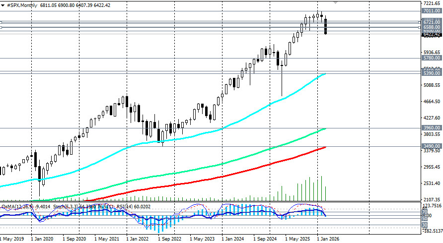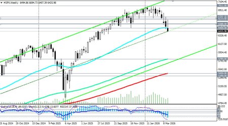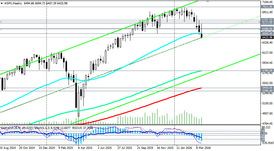 Цели: возврат выше 6650.00 откроет дорогу к 6695.00 (ЕМА144 на дневном графике), затем к 6755.00 (ЕМА50 на дневном графике) и выше – к 6800.00–6850.00. Сценарий В (экстремальный): полная коррекция к 5800.00 При сохранении текущих условий S&P500 может скорректироваться к зоне 5900.00-5780.00 (ЕМА144 на недельном графике), что также соответствует ценам на открытии 2025 года. Эти уровни также совпадают с минимумами июня 2025 года и рассматриваются как вероятная цель при затяжном кризисе. Заключение Американский фондовый рынок переживает период структурной переоценки. Пятая неделя падения, пробой ключевых технических уровней и кардинальный пересмотр ожиданий по ставкам — все это указывает на завершение фазы «легких денег» и переход к периоду повышенной неопределенности. Парадокс заключается в том, что фундаментальные показатели корпоративных прибылей остаются сильными, а технологический сектор стал значительно дешевле. Однако геополитический фактор и ястребиная пауза ФРС продолжают доминировать над настроениями рынка. Ключевая зона 6400.00–6500.00 (ЕМА50 на недельном графике) станет ареной решающей битвы в ближайшие дни. Удержание выше сохранит шансы на отскок к 6600.00-6700.00, но пробой ниже откроет дорогу к 6350.00 и 6200.00. При любом сценарии волатильность останется высокой. Инвесторам следует внимательно следить за развитием дипломатических контактов вокруг Ормузского пролива, ценами на нефть и, что наиболее важно, за риторикой представителей ФРС относительно дальнейших перспектив ставок. *см. также наши сегодняшние обзоры: