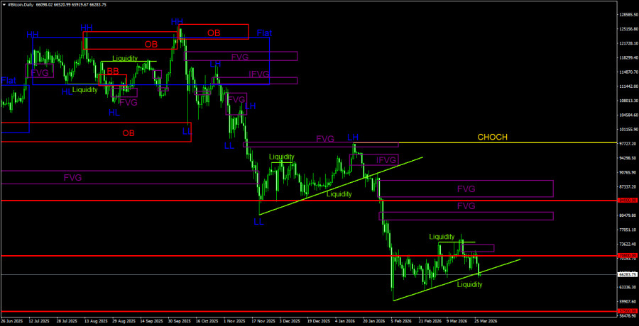 Биткоин продолжает некое подобие восходящего движения, которое является коррекцией, уже полтора месяца. На дневном ТФ это отлично видно. Снизу остается пул ликвидности, за которым цена сходит с вероятностью 90%. На 4-часовом ТФ отлично видно, насколько медленно растет биткоин, если вообще растет. Таким образом, наша точка зрения остается без изменений – нисходящий тренд не завершен, на рынке – пауза. Тем временем, аналитики JPMorgan сделали вывод, что биткоин за время войны в Иране стал... «тихой гаванью». И нет, это не шутка. Биткоин падает в последние 10 дней, когда стало понятно, что ФРС и другие центральные банки отказались от дальнейшего смягчения монетарной политики, а война в Иране имеет минимальные шансы на деэскалацию в ближайшее время. В целом, биткоин не может показать ощутимую коррекцию уже полтора месяца. И на фоне этого аналитики JPMorgan делают вывод, что биткоин теперь «тихая гавань» и соответственно привлекает инвесторов в эти смутные времена. Может быть, и привлекает, вот только цена на биткоин не растет, что говорит о большем количестве продаж на рынке. Однако аналитики JPMorgan также отмечают, что в последние недели золото и серебро подешевели, а биткоин... Об этом ничего не говорится, потому что на текущий момент с начала войны в Иране цена на биткоин не изменилась. То есть за целый месяц «тихая гавань» не подорожала ни на доллар. Тем не менее, в JPMorgan отмечают притоки капитала в первую криптовалюту, а трейдеры могут еще раз убедиться, насколько просто манипулировать информацией. Приток капитала может быть и увеличивается, вот только отток тоже может расти. Таким образом, как вывод, можем сказать, что за последний месяц ничего позитивного для «цифрового золота» в мире не произошло. Ужесточение настроя центральных банков и война в Иране – это, скорее, факторы, которые будут оказывать дополнительное давление на биткоин.