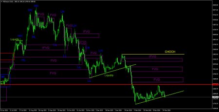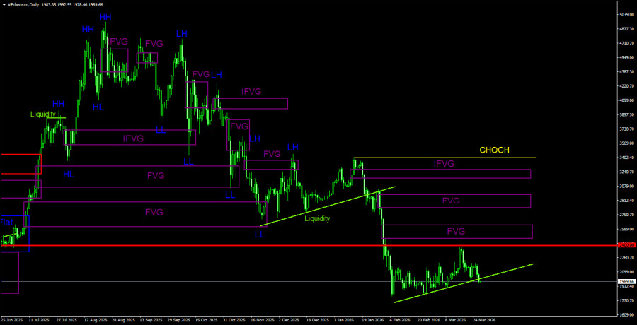 Биткоин продолжает формирование полноценного нисходящего тренда. Мы продолжаем ожидать падения с целью 57 500$(уровень 61,8% по Фибоначчи от трехлетнего восходящего тренда), а признаков разворота тренда в данное время ни одного. Но даже уровень 57 500$ теперь не выглядит, как конечная остановка. Из областей POI в данное время можно отметить только ближайший «медвежий» FVG на дневном ТФ и ближайшие FVG на 4-часовом ТФ. Однако на 4-часовом ТФ характер движения биткоина вновь обладает всеми признаками флэта, а цена опустилась к нижней границе бокового канала. Возможны девиация или отскок.Рекомендации по торговле ETH/USD: