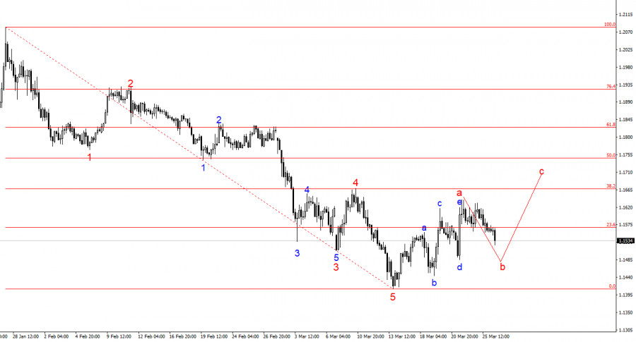 Волновая разметка инструмента EUR/USD остается вполне понятной для начинающих трейдеров. Мы увидели классическую пятиволновую импульсную понижательную структуру волн с классическим удлинением в третьей волне. После этого началось построение коррекционного набора волн, который по классике должен состоять минимум из трех волн. Коррекции всегда сложны для отработки и по своей внутренней структуре, которая может принимать гораздо более сложный, чем трехволновой вид. Уже сейчас мы видим, что построено пять волн вверх, которые, вероятнее всего, являются структурой a-b-c-d-e. Так как эта структура достаточно слабая, я предполагаю, что она принадлежит к старшей коррекционной волне a. Если это предположение верно, то уже сейчас мы наблюдаем снижение котировок в рамках волны b, которая может завершиться в любой момент. Исходя из всего вышесказанного, я могу посоветовать новичкам ждать завершения построения коррекционной волны b, что может произойти около 15-й фигуры. После этого можно рассматривать покупки с целями, расположенными около 17-й фигуры. Если лоу волн b и d окажутся пробитыми, волновая разметка потребует внесения коррективов, а сценарий с построением волны с фактически будет отменен. В данное время влияние новостного фона на инструмент EUR/USD остается сильным. На прошлой неделе участники рынка получили важную информацию от ФРС и ЕЦБ. На этой неделе, ушат холодной воды на участников всех рынков сначала вылил Дональд Трамп, а затем – Иран. Трейдеры не понимают, чего ожидать от ситуации на Ближнем Востоке. То ли переговоров и перемирия, то ли новых военных операций, новых ударов по энергетике, ядерным, нефтяным, газовым и правительственным объектам. На текущий момент нельзя сказать, что обстановка на Ближнем Востоке улучшилась хотя бы немного, а усилия Дональда Трампа по успокоению рынков и стабилизации цены на нефть ни к чему не привели. К текущему снижению инструмента я отношусь, как коррекционной волне, которая может завершиться уже в понедельник. Однако следует помнить, что любая новость геополитического характера, которая укажет на эскалацию конфликта, может привести к сильному росту спроса на валюту США. В этом случае волновая разметка будет сломана.Торговые рекомендации: