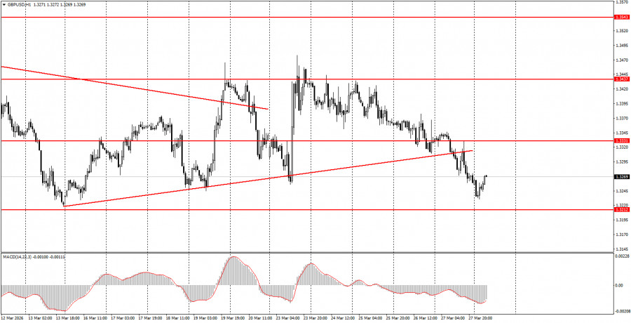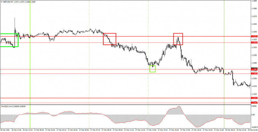 Пара GBP/USD в течение пятницы также продолжала движение на Юг, но гораздо более сильное, чем пара EUR/USD. Можно сказать, что в условиях топливного кризиса и сложной геополитики на Ближнем Востоке европейская валюта чувствует себя более уверенно и стабильно. Так или иначе, восходящая линия тренда на часовом ТФ преодолена, поэтому теперь можно вновь говорить о нисходящем тренде. Трейдеры на прошлой неделе не поверили Дональду Трампу, поэтому доллар вновь растет в цене. На этой неделе на Ближнем Востоке вполне может начаться сухопутная военная операция, так как многие эксперты указывают сейчас на остров Харк, через который проходит экспорт практически всей иранской нефти. Таким образом, захват этого острова не просто парализует экспорт нефти из Ирана, он заблокирует финансовую возможность Тегерану противостоять США. На наш взгляд, все идет к расширению конфликта на Ближнем Востоке, что может спровоцировать новый рост американской валюты вне зависимости от макроэкономической статистики на этой неделе.5M график пары GBP/USD.
