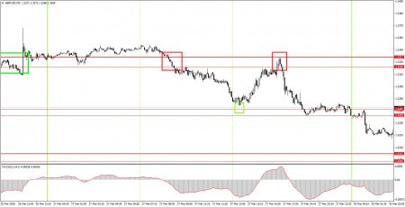 1) Сила сигнала считается по времени, которое потребовалось на формирование сигнала(отскок или преодоление уровня). Чем меньше времени потребовалось, тем сильнее сигнал. 2) Если около какого-либо уровня были открыты две или больше сделки по ложным сигналам, то все последующие сигналы от этого уровня следует игнорировать. 3) Во флэте любая пара может формировать массу ложных сигналов или же не формировать их вовсе. Но в любом случае при первых признаках флэта лучше переставать торговать. 4) Торговые сделки открываются во временной период между началом европейской сессии и до середины американской, после чего все сделки должны быть закрыты вручную. 5) На часовом ТФ по сигналам от индикатора MACD желательно торговать только при наличие хорошей волатильности и тренда, который подтверждается линией тренда или трендовым каналом. 6) Если два уровня расположены слишком близко друг к другу(от 5 до 20 пунктов), то следует рассматривать их, как область поддержки или сопротивления. 7) При прохождении 20 пунктов в верном направлении следует выставить Stop Loss в безубыток.Что на графике: