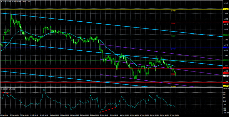 Валютная пара EUR/USD в течение все также продолжала вялое нисходящее движение. Рынок как будто каждый день отвечает на заявления Дональда Трампа о том, что финал войны на Ближнем Востоке близок, Америка добьется всех поставленных целей, захватит всю нефть в регионе, а Тегеран уже готов принять любые условия соглашения, лишь бы завершить войну. Если кто-то не понял, это сарказм. Если доллар США дорожает, значит рынок по-прежнему ожидает только одного – эскалации конфликта. В противном случае антирисковые настроения снизились бы, а инвесторы вновь начали искать более выгодное пристанище для своих капиталов, чем доллар. За последние несколько дней Дональд Трамп сделал уйму «важных» заявлений, которые Иран продолжает упорно отвергать и отрицать. По словам Трампа, большую часть 15-пунктового соглашения Иран согласился принять. Поэтому Вашингтон раздумывает над тем, чтобы запросить еще несколько пунктов. В то же время в Иране сообщили, что никаких согласий с «планом Трампа» не давали, а наоборот выдвинули свои 5 условий. И пять условий Ирана выглядят вполне логично и прозрачно, в отличие от 15 ультиматумов Трампа, о которых никто ничего не знает. Иран хочет репараций, платы за проход иностранными судами Ормузского пролива, снятия санкций. В противном случае война продолжится, а Ормузский пролив останется заблокированным. Кстати, сегодня официально вступил в войну Йемен, нанеся несколько ударов по Израилю. Напомним, что ранее Йемен неоднократно угрожал заблокировать Баб-эль-Мандебский пролив, что уже точно доведет цены на нефть до 150-200$ за баррель. Таким образом, мы считаем, что козыри сосредоточены на руках Ирана, а у Трампа – только двойки и тройки, которые он усердно пытается разыграть блефом. Буквально вчера президент США заявил, что, если Иран откажется от предложенных условий, Америка полностью уничтожит иранские электростанции, нефтяные поля, остров Харк, а также станции по опреснению воды. Может ли подобное заявление испугать Иран? На наш взгляд, нет. Все электростанции уничтожить не получится, Иран в ответ будет наносить удары по американским базам и союзникам в регионе, а правительство Ирана в данное время получает в три раза больше денег от экспорта нефти, чем до войны. До войны, буквально еще месяц назад, Иран экспортировал около 1 млн баррелей в сутки по цене около 47$. Сейчас он экспортирует 1,5 млн баррелей в сутки по цене 124$. Поэтому Иран от этой войны, как бы это дико не звучало, не проигрывает. Иран, как обладатель не только огромных запасов нефти, но и контроля на Ормузским проливом, может сейчас диктовать свои условия всему миру. Хотите воевать? Хорошо, будете платить за нефть и газа в 2-3-4 раза больше, чем до войны. А на деньги, полученные от продаж нефти, Иран потом спокойно восстановит всю разрушенную инфраструктуру. Однако вряд ли Дональд Трамп просто так отступит и, по сути, признает свое поражение на Ближнем Востоке. Скорее всего, наземному наступлению, как минимум, на остров Харк все-таки быть. Средняя волатильность валютной пары EUR/USD за последние 5 торговых дней по состоянию на 31 марта составляет 69 пунктов и характеризуется, как «средняя». Мы ожидаем движение пары между уровнями 1,1383 и 1,1521 во вторник. Старший канал линейной регрессии развернулся вниз, что указывает на смену тренда. Индикатор CCI заходил в область перепроданн