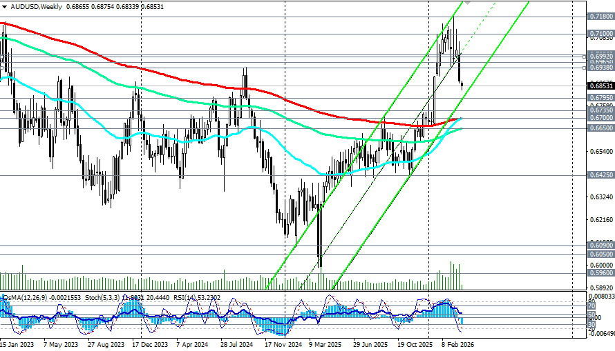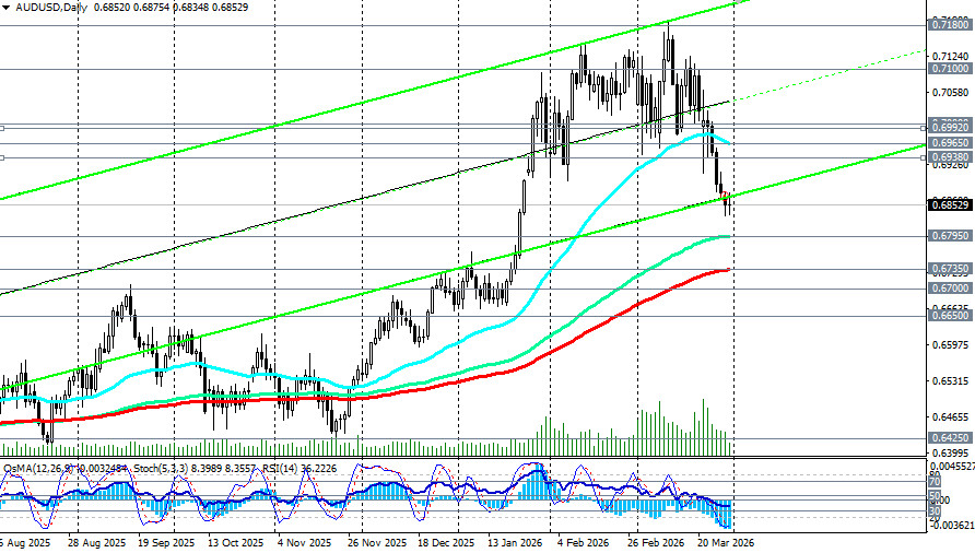 Таким образом, майское повышение становится все более вероятным, если конфликт сохранится. Фактор доллара: выжидательная позиция ФРС Председатель ФРС Джером Пауэлл в понедельник заявил, что «политика находится в хорошем положении, чтобы подождать и посмотреть, как развернется текущая ситуация». Он отметил, что «события на Ближнем Востоке влияют на цены на газ», но подчеркнул «склонность - не обращать внимания на шоки предложения», хотя необходимо следить за инфляционными ожиданиями. Пауэлл также отметил, что «инфляция из-за тарифов - это однократное повышение цен», и что «инфляционные ожидания, по-видимому, закреплены». Согласно инструменту CME FedWatch, трейдеры все больше ожидают, что ФРС сохранит ставки на текущем уровне до 2026 года, после того как ранее в ценах была заложена почти 50% вероятность повышения. Комментарии Пауэлла не дали оснований для ожиданий ранних повышений, и денежные рынки вновь переключились на учет снижения ставки ФРС к концу года. Однако индекс доллара USDX торгуется около 100.30, находясь вблизи десятимесячных максимумов. Данные по открытым вакансиям JOLTS за февраль (публикация в 14:00 GMT) ожидаются устойчивыми, что может поддержать доллар, в то время как данные по потребительскому доверию за март могут показать возвращение к минимумам. Краткий технический анализ На дневном графике AUD/USD находится несколько ниже линии поддержки восходящего канала с границами 0.7220-0.6860, но выше ключевых среднесрочных уровней поддержки 0.6795, 0.6735 (ЕМА144 и ЕМА200), что сохраняет преимущество длинных среднесрочных позиций. Долгосрочный тренд пары также поддерживается ключевыми уровнями поддержки 0.6700 (ЕМА200 на недельном графике), 0.6650 (ЕМА144 на недельном графике). Технические индикаторы (в нашем случае это OsMA, Стохастик) на дневном и недельном графиках сохраняют сигнал на продажу, двигаясь в зоне медвежьего рынка, но RSI со значением 56 на недельном графике остается в зоне покупок (выше 50). Заключение Пара AUD/USD оказалась в классической ловушке между ястребиной позицией RBA и укрепляющимся долларом США. Резервный банк Австралии сохраняет возможность повышения ставки в мае, особенно если конфликт в Иране продолжится и инфляционные эффекты станут более очевидными. В то же время, ФРС заняла выжидательную позицию, подчеркивая, что «политика находится в хорошем положении, чтобы подождать и посмотреть». Ключевая зона 0.6800–0.6900 станет ареной решающей битвы в ближайшие дни. Удержание выше сохранит шансы на отскок к 0.6938 (ЕМА200 на 1-часовом графике), но пробой ниже откроет дорогу к 0.6735-0.6700. При любом сценарии волатильность останется высокой. Инвесторам следует внимательно следить за развитием дипломатических контактов вокруг Ормузского пролива и, что наиболее важно, за предстоящими данными по занятости в США и инфляции в Австралии. Майское решение RBA будет зависеть больше от конфликта в Иране и его последствий, чем от «нормального» экономического развития. Успех будет на стороне тех, кто сможет оценить баланс между ястребиным RBA и укрепляющимся долларом в условиях сохраняющейся геополитической неопределенности.Материал предоставлен компанией InstaForex - www.instaforex.com