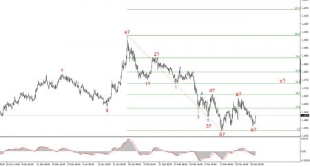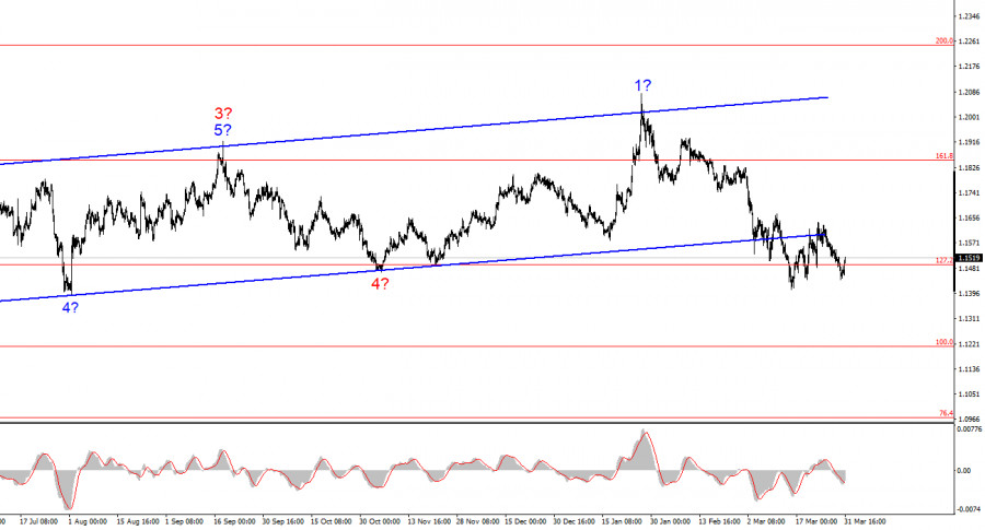 Курс инструмента EUR/USD в течение вторника повысился на 70 базовых пунктов. Причин было несколько, чтобы впервые за долгое время участники рынка кинулись покупать не евро, а доллар. Во-первых, Дональд Трамп ночью вновь заявил о том, что война на Ближнем Востоке скоро закончится, а Ормузский пролив может остаться под контролем Ирана. Главное – чтобы он был разблокирован. Не знаю, сколько рынок может топтаться по одним и тем же граблям, но трейдеры вновь поверили Трампу, а спрос на валюту США начал снижаться. Во-вторых, отчет по инфляции в Евросоюзе за март, как и ожидалось, показал сильное ускорение – с 1,9% г/г до 2,5%. Несмотря на то, что ожидания рынков были еще выше, даже значения 2,5% хватило, чтобы трейдеры обрели уверенность в ужесточении денежно-кредитной политики ЕЦБ в апреле. В-третьих, волновая разметка предполагала построение минимум еще одной повышательной волны, о чем я регулярно говорил в своих обзорах. Мы увидели полноценную пятиволновую импульсную нисходящую структуру, поэтому после ее завершения должна была быть построена трехволновая(как минимум) коррекция. Первые две волны мы увидели, значит еще должна быть построена волна с с целями около 17 фигуры и выше. Я предполагал, что построение волны b завершится около 15-й фигуры, но по итогу котировки евровалюты опустились до отметки 1,1445. Впрочем, это не нарушило коррекционную структуру. Следовательно, вне зависимости от новостного фона в ближайшие дни можно ожидать повышения инструмента. А серия отчетов из США может оказать вновь слабой, что лишь поддержит построение повышательной волны с.Общие выводы