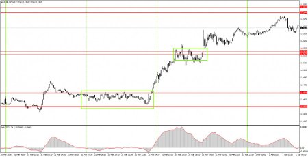 1) Сила сигнала считается по времени, которое потребовалось на формирование сигнала(отскок или преодоление уровня). Чем меньше времени потребовалось, тем сильнее сигнал. 2) Если около какого-либо уровня были открыты две или больше сделки по ложным сигналам, то все последующие сигналы от этого уровня следует игнорировать. 3) Во флэте любая пара может формировать массу ложных сигналов или же не формировать их вовсе. Технические уровни могут игнорироваться. 4) На часовом ТФ по сигналам от индикатора MACD желательно торговать только при наличие хорошей волатильности и тренда, который подтверждается линией тренда или трендовым каналом. 5) Если два уровня расположены слишком близко друг к другу(от 5 до 20 пунктов), то следует рассматривать их, как область поддержки или сопротивления. 6) При прохождении 15 пунктов в верном направлении следует выставить Stop Loss в безубыток.Что на графиках: