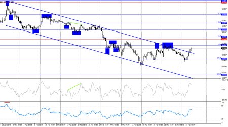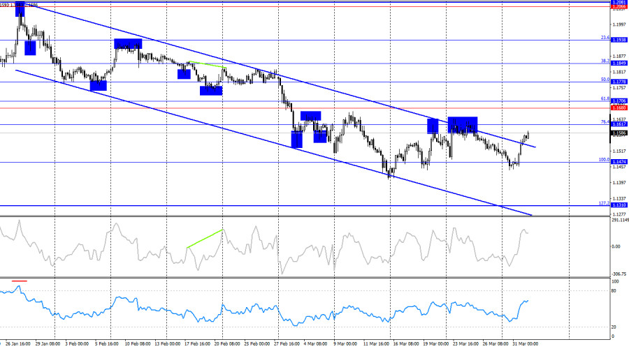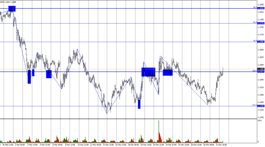 Ситуация с волнами на часовом графике принимает довольно сложный вид. Последняя завершенная волна вверх пробила пик предыдущей волны всего на несколько пипсов, а новая волна вниз пробила предыдущий лоу. Таким образом, тренд в данное время вновь изменился на «медвежий», но уже сегодня или завтра новая волна вверх может пробить предыдущий пик. Действия Дональда Трампа на Ближнем Востоке спровоцировали в регионе масштабные военные действия и энергетический кризис, что образовало беспрецедентную поддержку доллару. Во вторник информационный фон был достаточно интересным. Начался день с новых выступлений Джерома Пауэлла и Дональда Трампа, каждое из которых поддержало быков. Трамп готов отдать приказ о завершении «иранской операции» в ближайшее время, а Джером Пауэлл не видит оснований для ужесточения параметров ДКП. Оба этих фактора не поддерживают медведей EUR/USD и доллар. Помимо этого, уровень инфляции в Евросоюзе вырос по итогам марта до 2,5% г/г. И хоть это значение ниже ожиданий трейдеров, нельзя не отметить сильный рост индекса потребительских цен с началом энергетического кризиса. Не все экономисты ожидают ужесточения денежно-кредитной политики ЕЦБ в апреле, но все трейдеры понимают: если инфляция будет расти такими темпами, то Европейскому регулятору придется вмешаться повышением процентных ставок. Для евровалюты это позитивные вести. Во вторник информационный фон впервые за несколько недель повернулся к европейской валюте передом, что и позволило быкам провести атаку.