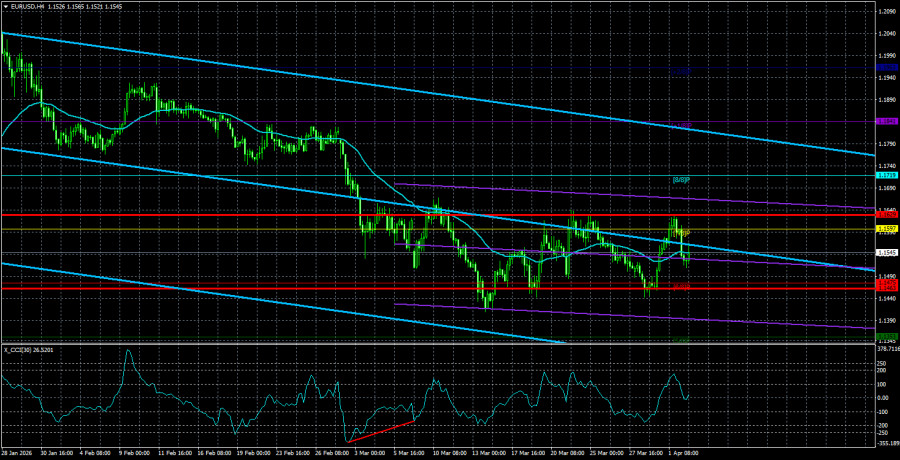 Валютная пара EUR/USD в течение четверга вновь развернулась и на этот раз устремилась уже вниз. Происходящее в мире, происходящее в США, происходящее в Белом доме, происходящее в голове Трампа напоминает уже какой-то каламбур. Постоянные наши читатели знают, что мы очень часто употребляем слово «каламбур» или слово «цирк», как только Трамп становится президентом США. Ну а как относится к заявлениям американского президента иначе? Если раньше Трамп чередовал противоречивую риторику хотя бы между отдельными днями, то сейчас в течение одного выступления может сделать с десяток противоречащих друг другу заявлений. Если раньше Трамп обходился одними лишь оскорблениями всех и вся неугодных ему, то сейчас еще и инициирует судебные расследования, придумывает различные поводы для увольнения или же для целых военных операций на чужой территории. Раньше различные статистические порталы, вроде YouGov, насчитывали по 15 ложных заявлений в день от американского президента, а сейчас, наверное, уже сбились со счета, потому что теперь даже не понять – какое из заявлений ложное? Или ложные вообще все? Складывается ощущение, что риторика Трампа – это некая форма НЛП(нейролингвистическое программирование), способ воздействия вербальными методами на подсознание. Самое интересное, что рынок с удовольствием отрабатывает каждое новое заявление Трампа. Так как их тональность и характер меняются со скоростью света, то на графиках мы наблюдаем постоянные прыжки цены то вверх, то вниз. То есть рынок из раза в раз наступает на те же самые грабли – верит Трампу. Хотя тезис «наступает» был применим во время первой каденции в Белый дом республиканца. Сейчас рынок уже прекрасно осведомлен о всех методах одиозного бизнесмена, но все равно продолжает из раза в раз прыгать с разбегу на те же самые грабли. Естественно, для трейдеров текущее время – максимально непривлекательное для торговли. Во-первых, рынок полностью игнорирует любой макроэкономический фон. Во-вторых, рынок игнорирует любой фундаментальный фон. В-третьих, рынок игнорирует любые технические факторы. А все движения на рынке зависят теперь от высказываний Трампа и время от времени – официальных лиц Ирана. То есть от тех событий, которые заранее предугадать невозможно. Более того, невозможно предугадать не только, что именно скажет Трамп, но и когда он это скажет. К примеру, все трейдеры знают, что сегодня выйдет отчет NonFarm Payrolls. Кто-то может ожидать сильного значения, кто-то слабого, а кто-то – не захочет рисковать и просто выйдет с рынка. В случае с Трампом последний, третий вариант невозможен, потому что Трамп выступает или делает посты в своей собственной социальной сети по 5-10 раз в день. Точно также рынок не может физически знать, когда Трамп или Тегеран нанесет следующий удар по вражеской инфраструктуре. На выходе мы имеем разнонаправленные полеты, которые не смог бы спрогнозировать никто на Земле, кроме самого Трампа или первых лиц Ирана и стран Ближнего Востока. Средняя волатильность валютной пары EUR/USD за последние 5 торговых дней по состоянию на 3 апреля составляет 83 пункта и характеризуется, как «средняя». Мы ожидаем движение пары между уровнями 1,1463 и 1,1629 в пятницу. Старший канал линейной регрессии развернулся вниз, что указывает на смену тренда. Индикатор CCI заходил в область перепроданн