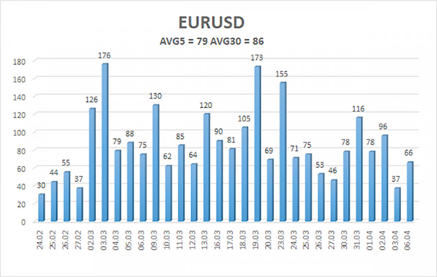 Валютная пара EUR/USD в течение понедельника продолжала торговаться очень слабо и неохотно. В принципе, это не удивительно, ибо по католическому календарю 6 апреля – Пасхальный понедельник. Во-первых, это праздник. Во-вторых, уже 6 апреля Дональд Трамп мог отдать приказ о проведении новой воздушной операции в Иране. Таким образом, трейдеры с самого начала не были настроены на открытие позиций. По прошествии нескольких недель можно с уверенностью сказать, что рынок в принципе уже довольно долгий срок не спешит ни с покупками доллара, ни с продажами. Мы регулярно говорили о том, что каким бы сильным ни был геополитический фактор, рынок не может отрабатывать только его и постоянно его. Война между Украиной и Россией длится уже пятый год, но никто среди инвесторов и трейдеров уже давно не беспокоится по этому поводу. Хотя изначально военные действия в Восточной Европе также оказали серьезное влияние на нефтяные цены и нефтяные потоки. Таким образом, мы считаем, что геополитика уже начала отходить на второй план. Пока что это лишь начальный этап отхождения, так как макроэкономический фон рынок продолжает игнорировать. Тем не менее, мы уже не видим ежедневного роста доллара, хотя ситуация на Ближнем Востоке лучше не становится. На наш взгляд, рынок находится даже не в выжидательной позиции, а в позиции последней надежды. Дональд Трамп в третий раз перенес конечный срок, к которому Иран должен успеть открыть Ормузский пролив. Теперь он истекает сегодня в 20-00 по американскому времени. Что будет дальше – вероятно, все догадываются. Иран же продолжает занимать свою позицию и не готов идти ни на какие уступки. О переговорах между Тегераном и Вашингтоном мы слышим только из уст Трампа, но согласитесь крайне сложно верить в наличие переговоров, если практически каждый день Трамп угрожает полным уничтожением Ирана. Мы считаем, что в текущих обстоятельствах лучше всего поможет гадание на кофейной гуще. Действия Трампа предугадать невозможно, наличие переговоров Иран не подтверждает, многочисленные инсайды зачастую противоречат друг друга, ибо у каждого журналиста свой источник, а источники делятся совершенно разной информацией. Поэтому, как и раньше, лучше всего дождаться достоверной информации и работать с ней. Мы же лишь напомним, что в данное время все фундаментальные, макроэкономические и технические факторы не имеют никакого значения. Цена в последние несколько недель прыгает то вверх, то вниз, но не потому, что находится во флэте, а потому что геополитический фон постоянно меняется. Примерно каждые два дня. Этот тот редкий случай, когда боковое движение полностью отражает новостной фон. Что касается среднесрочной перспективы пары EUR/USD, то мы по-прежнему считаем: если конфликт на Ближнем Востоке завершится в ближайшее время, европейская валюта вновь начнет расти и довольно быстро вернется к максимумам текущего года. Шанс доллара заключается только в дальнейшей эскалации на Ближнем Востоке. Средняя волатильность валютной пары EUR/USD за последние 5 торговых дней по состоянию на 7 апреля составляет 79 пунктов и характеризуется, как «средняя». Мы ожидаем движение пары между уровнями 1,1469 и 1,1627 во вторник. Старший канал линейной регрессии развернулся вниз, что указывает на смену тренда. Индикатор CCI заходил в область перепроданности и сформир