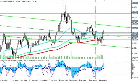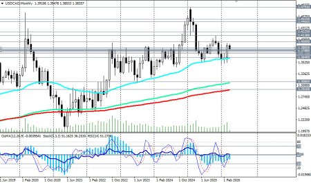 А самым ранним сигналом здесь может стать пробой уровня поддержки 1.3825 (ЕМА50 на недельном графике). Индикаторы дают смешанные сигналы: 14-дневный RSI находится немного выше нейтральной отметки 50 (на уровне 54,6), что говорит о сохраняющемся восходящем импульсе, OsMA рисует снижающиеся гистограммы в зоне продаж, а Стохастик находится в зоне перепроданности, но пока без признаков разворота. Парадокс же для USD/CAD также заключается в том, что падение цен на нефть ослабляет CAD, но одновременно снижает инфляционные ожидания в США, что может побудить ФРС к более мягкой политике, ослабляя американский доллар. Вектор дальнейшей динамики пары будет, вероятно, зависеть от того, какой из фундаментальных факторов окажется доминирующим. Уровни поддержки: 1.3825, 1.3815, 1.3800, 1.3795, 1.3788, 1.3770, 1.3735, 1.3700, 1.3640, 1.3600, 1.3500, 1.3100, 1.3080, 1.3000, 1.2910 Уровни сопротивления: 1.3845, 1.3865, 1.3900, 1.3940, 1.3960, 1.4000, 1.4100, 1.4140, 1.4200, 1.4225 Торговые сценарии