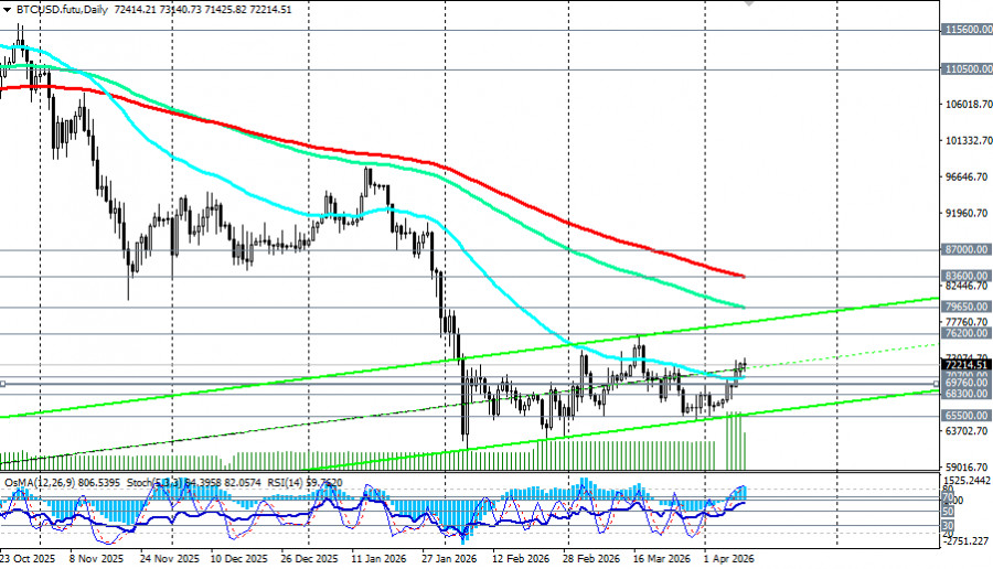 Цели: пробой 73140.00 откроет дорогу к 74000.00, затем к 76000.00-76200.00 и далее – к важному среднесрочному уровню сопротивления 79650.00 (ЕМА144 на дневном графике). В случае усиления позитивной динамики и пробое ключевой зоны сопротивления 83600.00 (ЕМА200 на дневном графике)-87000.00 (ЕМА50 на недельном графике) BTC/USD возвращается в зону среднесрочного бычьего рынка и продолжает развивать долгосрочную восходящую динамику. В альтернативном сценарии сигналом для новых продаж может стать пробой сегодняшнего минимума 71425.00, а затем уровня поддержки 70700.00 (ЕМА50 на дневном графике). Дальнейшее снижение и пробой 69000.00-68300.00 (ЕМА200 на недельном графике) станет возможным при: