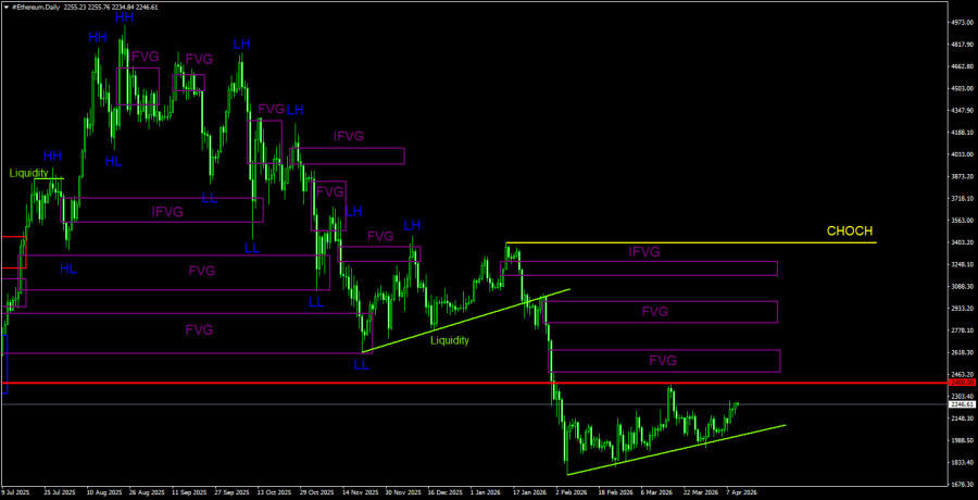 Эфир продолжает находиться в непонятном движении на 4-часовом ТФ и в восходящей коррекции на дневном. Сразу же стоит отметить, что движения эфира практически на 100% идентичны движениям биткоина. А значит обе криптовалюты по-прежнему демонстрируют крайне высокую степень корреляции. Так как биткоин толком не растет и не падает, то и эфир показывает точно такую же динамику. Какой выход из этой ситуации, если коррекция длится уже два месяца? Во-первых, следует помнить, что эфир будет двигаться ровно в ту сторону, в которую будет двигаться биткоин. Во-вторых, биткоин по-прежнему нацелен на восходящую коррекцию. В-третьих, и по биткоину, и по эфиру имеются пулы ликвидности, выраженные линиями тренда на дневном ТФ, а мы по-прежнему считаем, что цена обязательно сходит ниже этих линий тренда. В-четвертых, последние «медвежьи» FVG, сформированные в рамках последнего витка нисходящего тренда, так и не были отработаны. А именно они выступают ключевыми областями POI. Вчера в Штатах был опубликован очередной важный отчет, а криптовалютный рынок в очередной раз показал, что макроэкономическая статистика его не интересует. Инфляция в США выросла по итогам марта до 3,3%, а на криптовалютном рынке в ближайшее время наверняка начнутся разговоры о статусе защиты от высокой инфляции у основных криптовалют. Следует отметить, что в последние пять дней растет и эфир, и биткоин, что совпадает с падением американской валюты. А падение американской валюты началось, когда на Ближнем Востоке «запахло» перемирием. Эфемерное перемирие, которого фактически пока нет, пока очень слабо влияет на нефтяные котировки, но валютный и криптовалютный рынок отвечают сдержанными покупками.